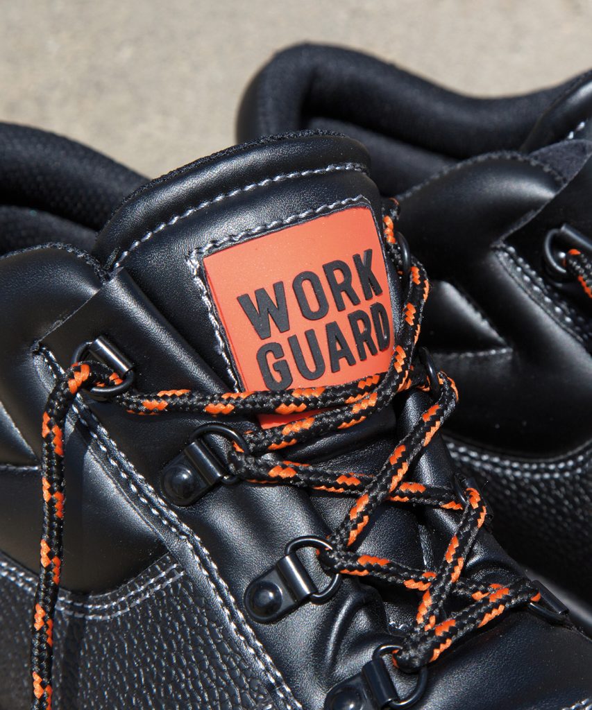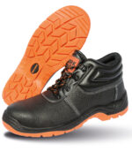 Upper: Black embossed split leather upper. Ankle internal: Inside lining ,mesh black. Toe: EVA black toe. Sole: Duel density Black/Orange PU sole |