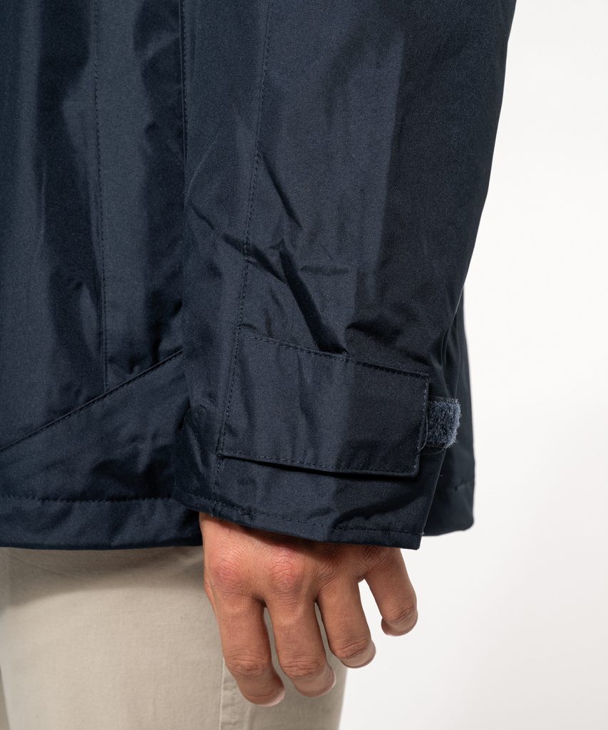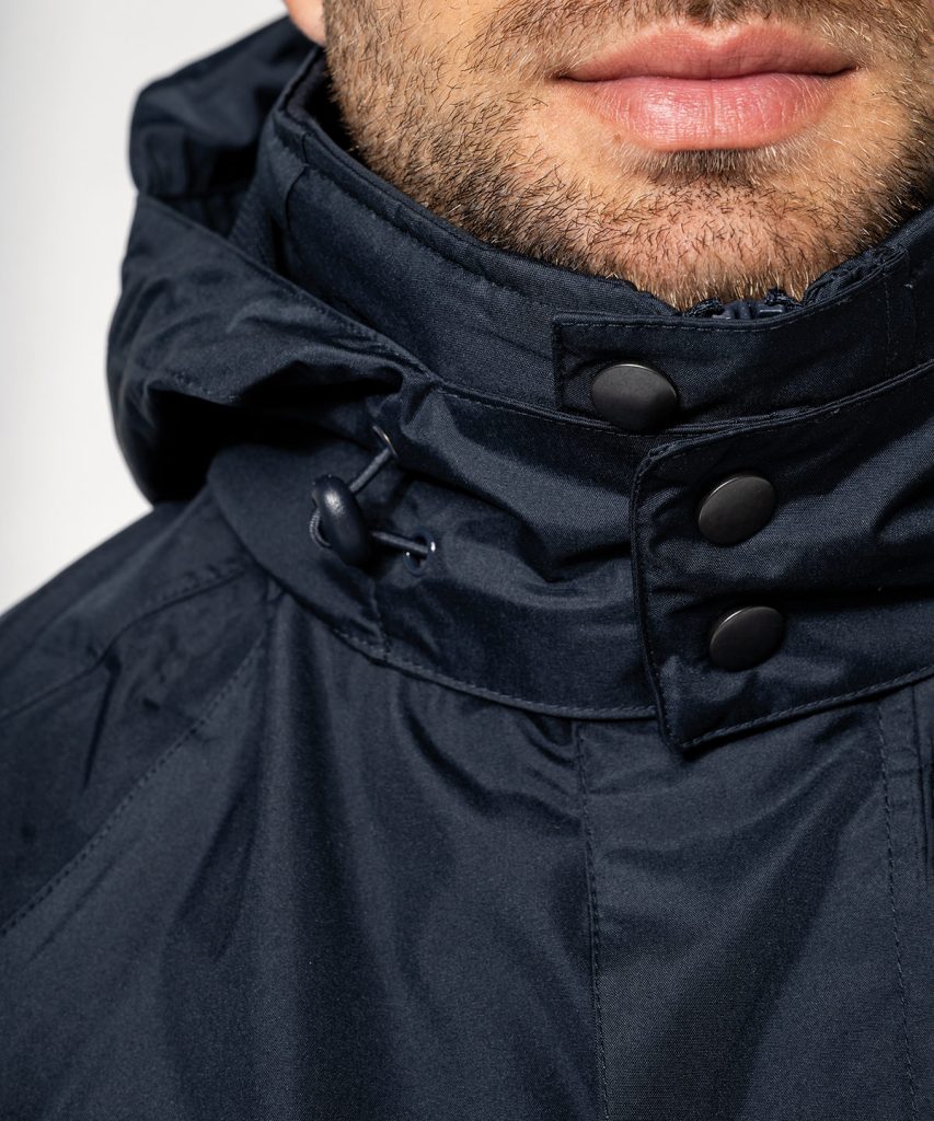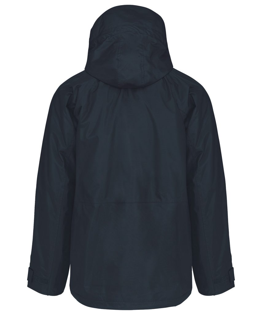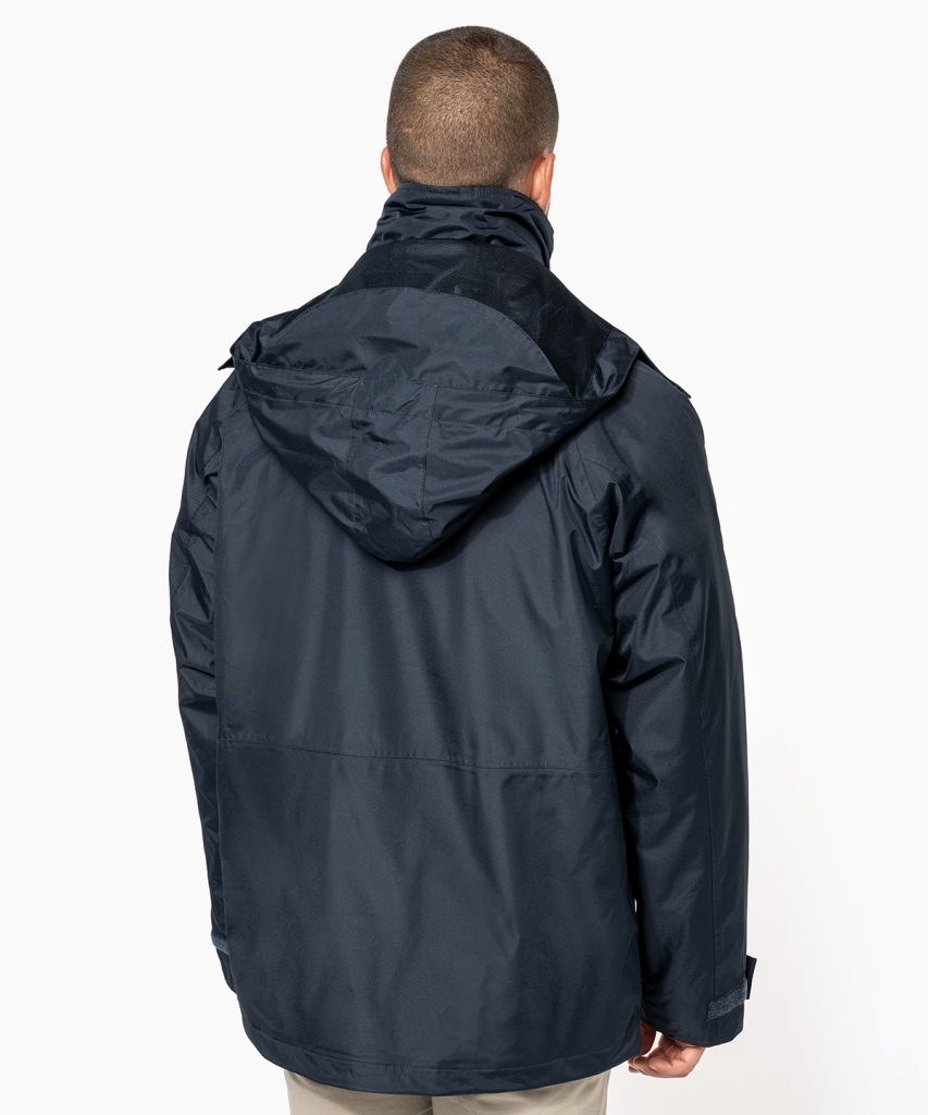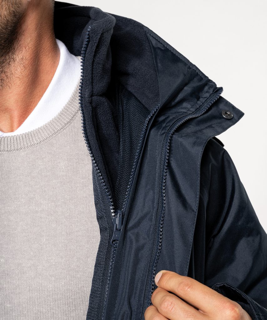 100% polyester outer with PVC coating. Water-resistant taped seams. 3-in-1 parka: dual-composition padding. Body: 100% polyester mesh. Sleeves: 100% polyester. Zip fastening and press stud placket. Fleece-lined neck. 3 zip pockets at the front with flap. Tear release adjustable cuffs. Press stud removable hood with mesh lining and stoppers. Inner zip access for decoration. Fleece jacket: 100% microfleece polyester. 100% polyester sleeve lining for easy removal. Zip fastening. 2 side pockets. Fleece jacket detachable by zip.