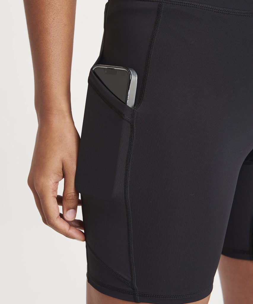The Just Cool womens recycled tech shorts have four-way stretch fabric for maximum comfort yet dont restrict your movement. They incorporate a sleek, fashion-forward design, while the two side pockets offer maximum space for carrying necessary items.