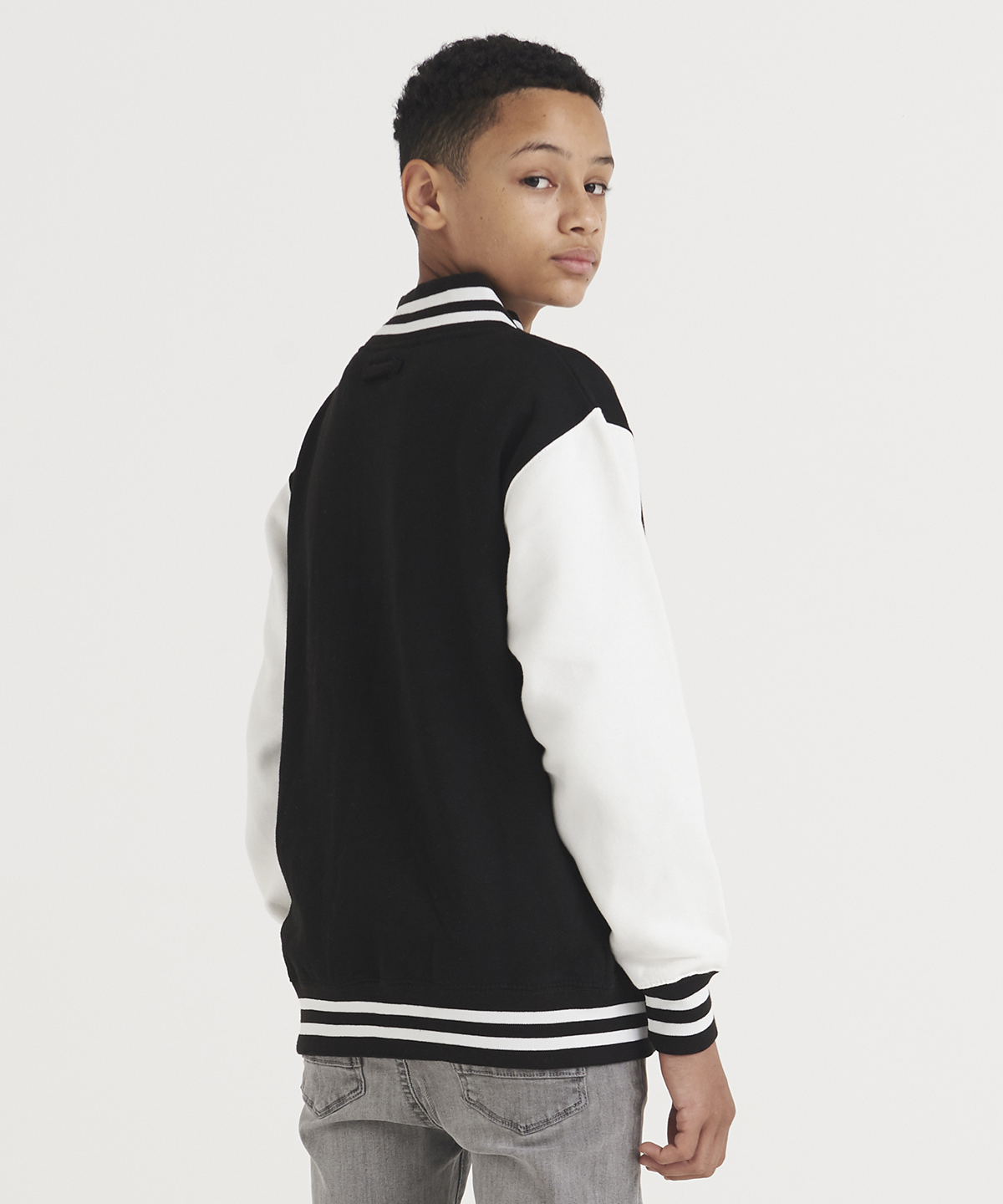 This kids varsity jacket is made in a sporty American style. It features a classic fit with contrast sleeves with excellent front popper fastening.
