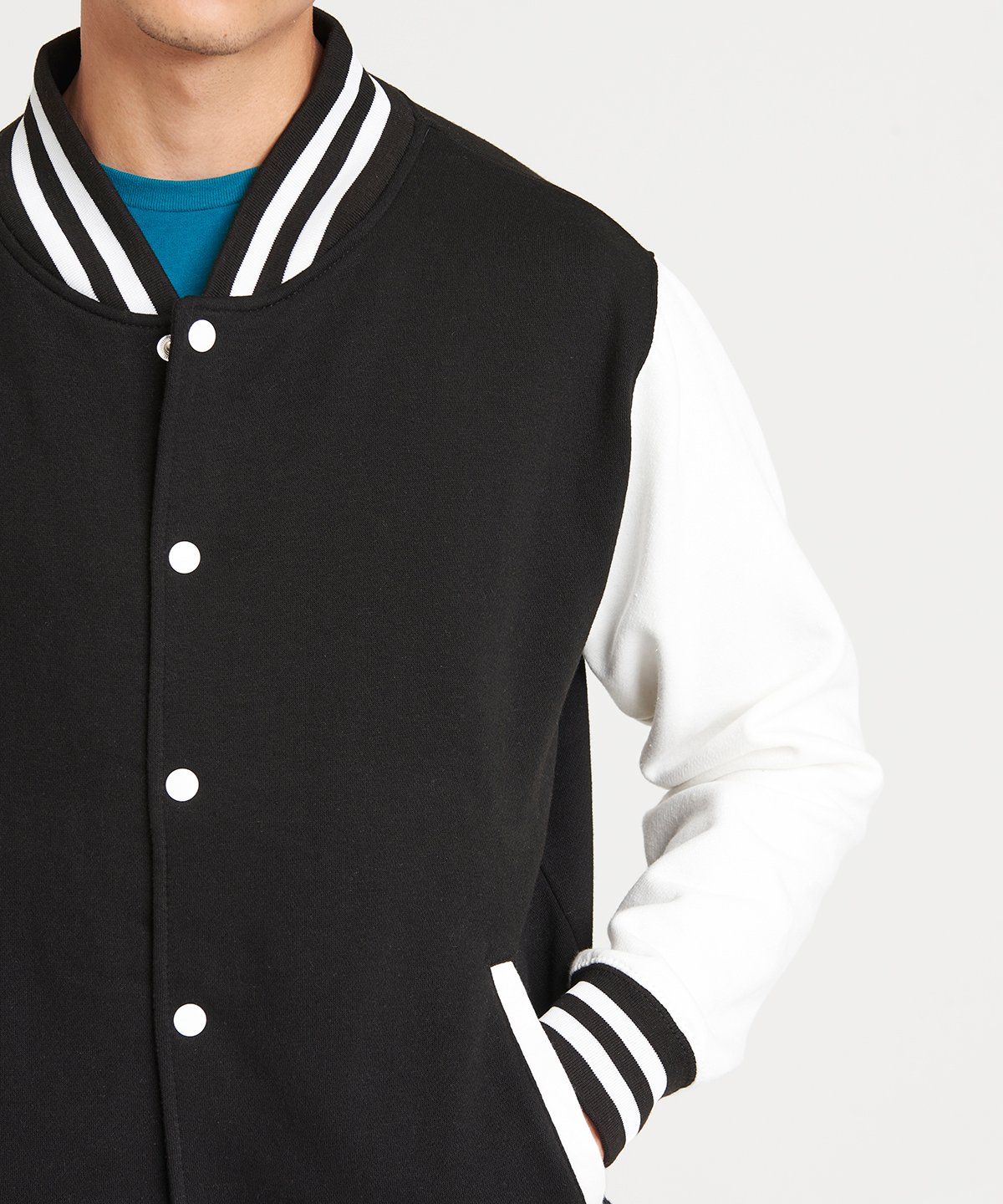 Get the varsity look with this classic American inspired jacket. Contrast sleeves and poppers complete this look which is fashioned from our heavyweight fabric which is ideal for decoration.