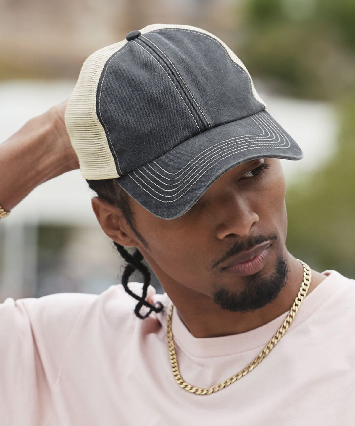The 6-panel vintage trucker cap is edgy, with its hint of distressed retro styling. Made from heavy-washed cotton with recycled polyester mesh panels, it has a relaxed, unstructured crown and a curved peak for a classic look. Contrast stitching adds extra detail, while the snapback adjuster ensures a perfect fit. A timeless, laid-back piece with vintage appeal.