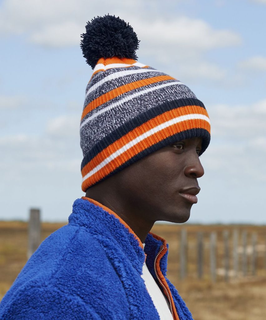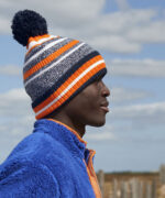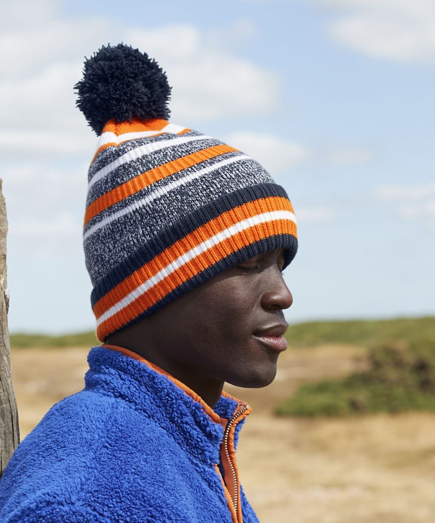 Celebrate team spirit with pride in this statement striped beanie, whether its for training or cheering on from the sidelines. Each vibrant, multi-stripe design stands out in the crowd, enhanced by a playful self-coloured pom pom. A double-layer knit, oversized cuff and soft microfleece lining deliver maximum comfort and optimum warmth. Contains certified recycled polyester.