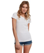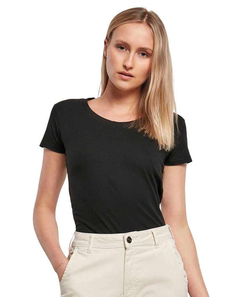 The cool women’s merch t-shirt is a casual basic item for an urban look. Wonderfully feminine with its tailored fit, the classic round neckline and short sleeves add a sporty nuance. This t-shirt looks equally good paired with jeans or a skirt and can be decorated with individual silkscreen or flex print.