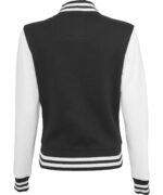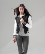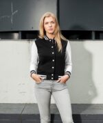 The college style presents itself as a cool stylish women’s jacket with contrasted cuffs to offer a preppy look and feel. The inside brushed sweat fabric ensures a comfortable fit. Typical details include; striped rib cuffs at the collar, hem and sleeves and metal press-buttons to emphasise the cool look. Two pockets on the front, set-in sleeves and neck half-moon with neck tape. This item is manufactured in a FAMA Certified factory. FAMA stands for Facility and Merchandise Authorisation and is a high standard production certificate.