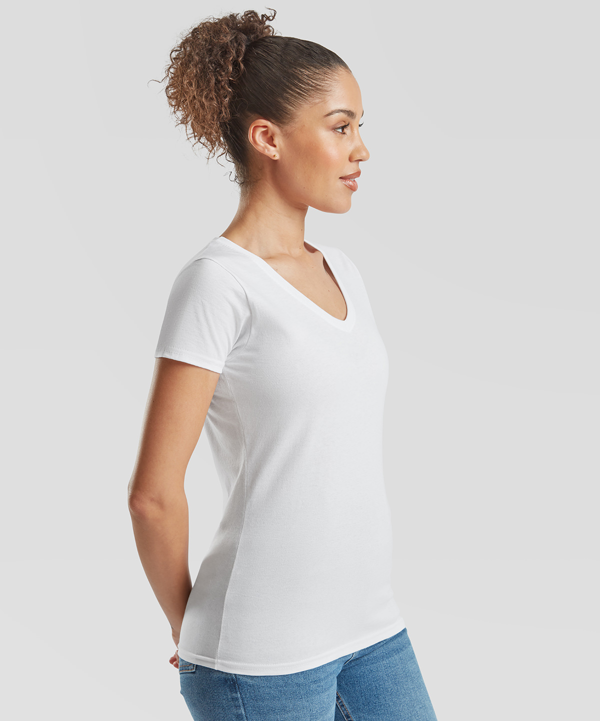 With a fine knit gauge for enhanced printability, the women’s Valueweight v-neck T is ideal for all kinds of garment decoration, offering shaped side seams for a feminine fit, a v-neck with cotton/Lycra rib and self-fabric back neck tape for comfort. Fruits women’s Valueweight v-neck T is available in a great range of colours.