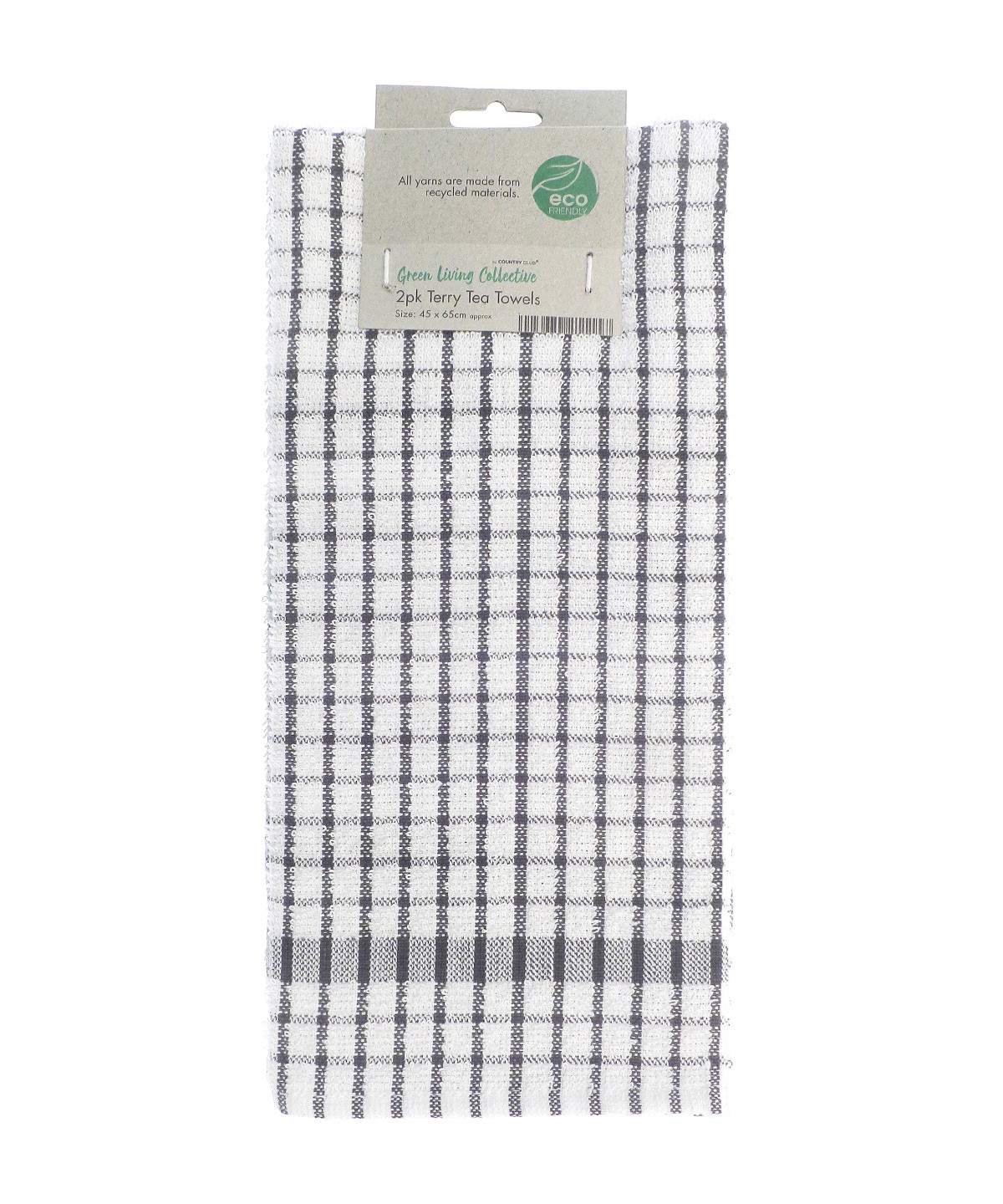 A double pack of eco-friendly terry tea towels all yarns are made from recycled materials. Soft, absorbent and with a chequered design.
