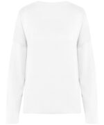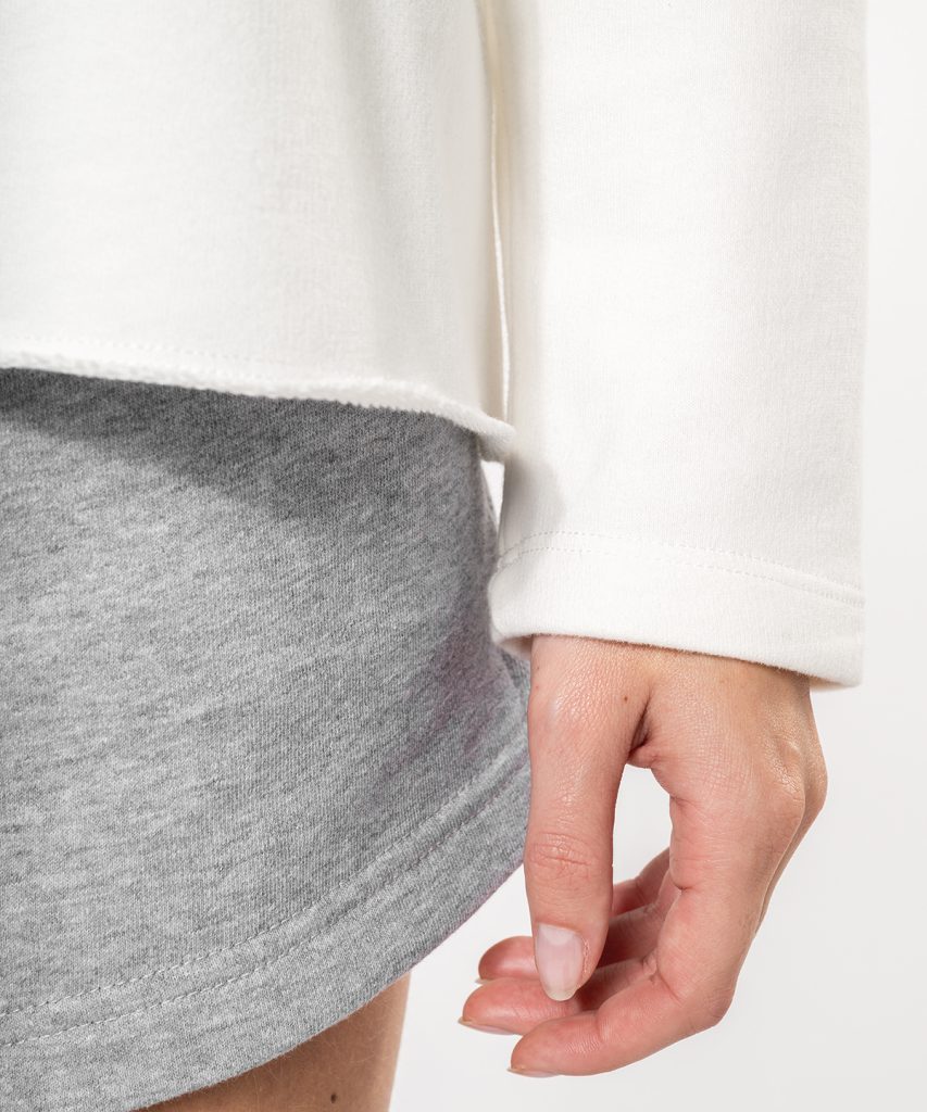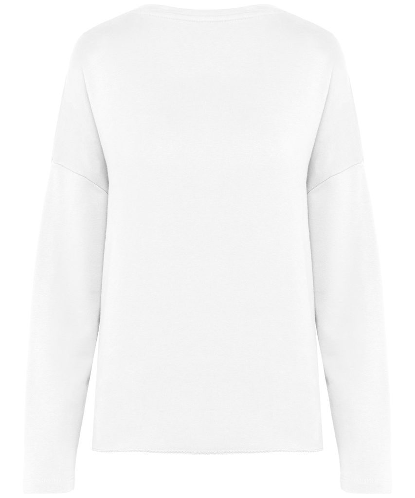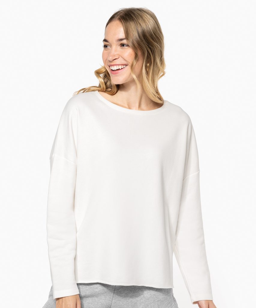 91% cotton/9% polyester (Light Grey Heather: 87% cotton/9% polyester/4% viscose). French terry. Ultra-soft fabric. Loose, relaxed fit with wide neck. Twill taped neck. Raw edge finish at hem. Twin needle finishing at cuffs. No brand label at neck, only size tag for easy relabelling. Certified STANDARD 100 by OEKO-TEXNー CQ1007/7, IFTH.