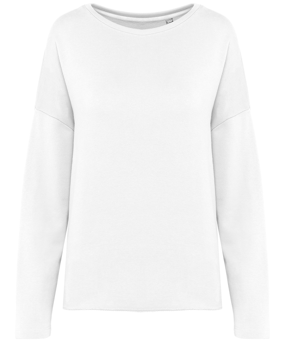 91% cotton/9% polyester (Light Grey Heather: 87% cotton/9% polyester/4% viscose). French terry. Ultra-soft fabric. Loose, relaxed fit with wide neck. Twill taped neck. Raw edge finish at hem. Twin needle finishing at cuffs. No brand label at neck, only size tag for easy relabelling. Certified STANDARD 100 by OEKO-TEXNー CQ1007/7, IFTH.