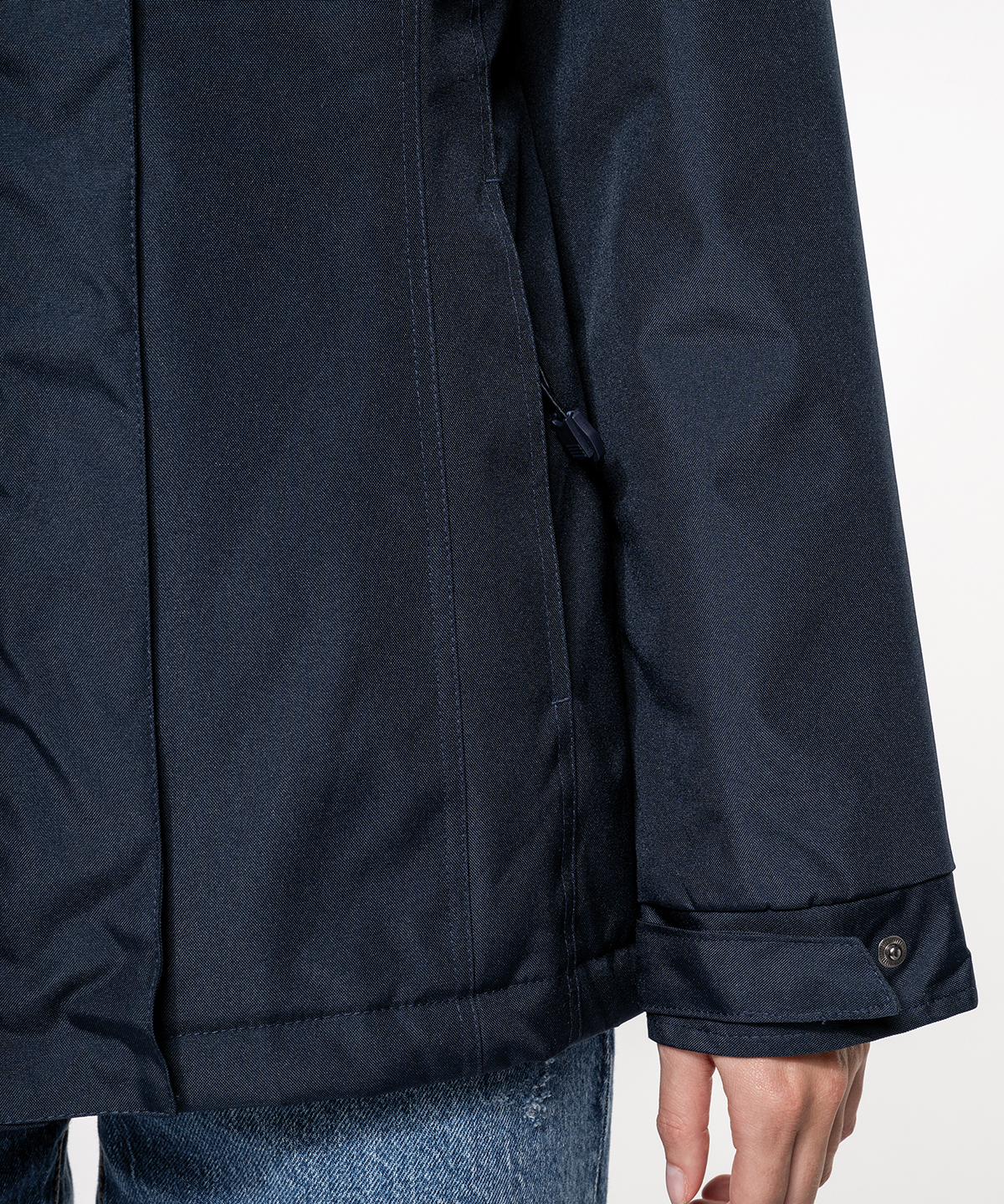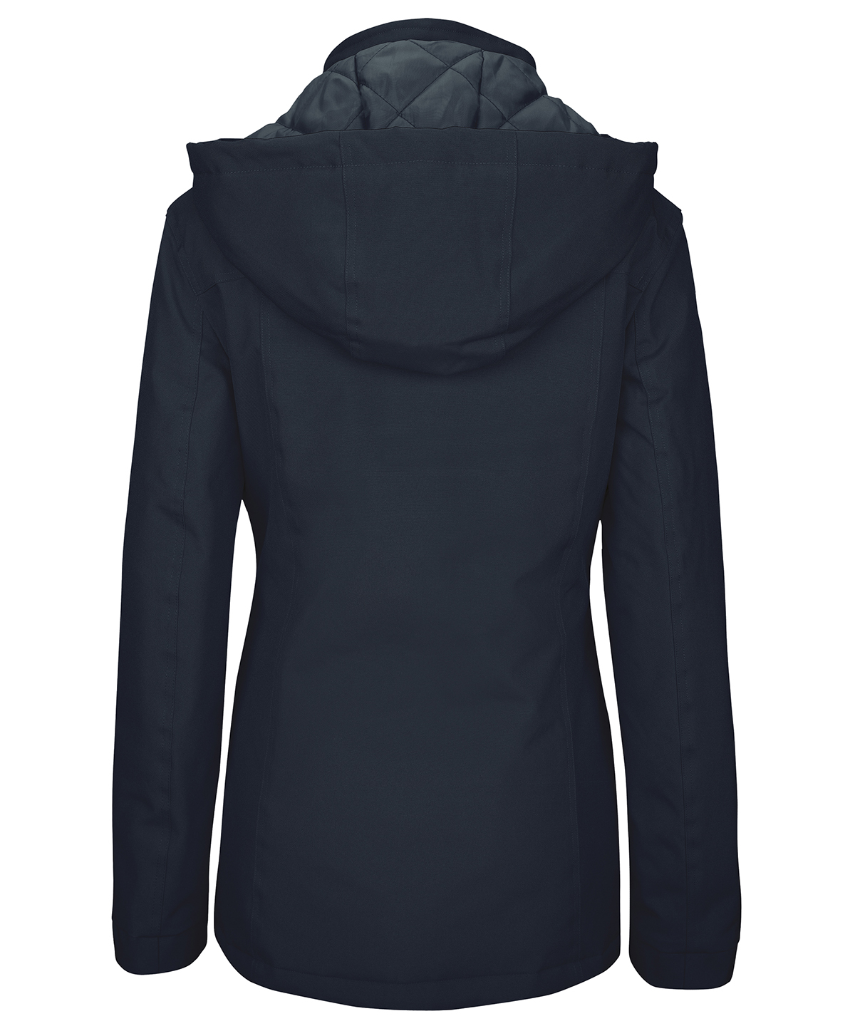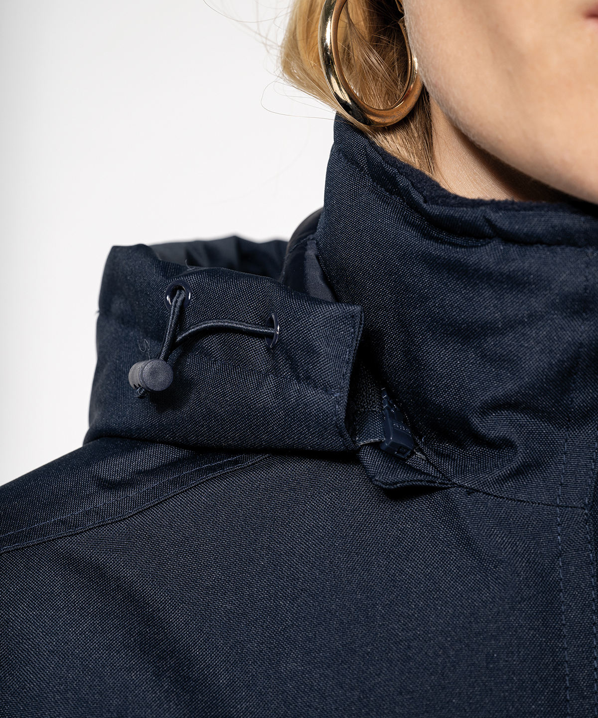 Outer: 100% polyester Oxford. Inner: quilted polyester. Zip fastening with invisible tab and press studs. 2 zipped outside pockets. 1 inside pocket. Detachable hood. Fleece-lined collar. Zip access for decoration.