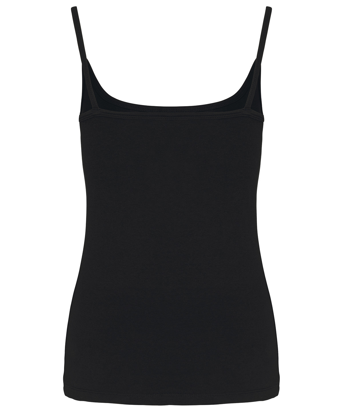 95% cotton / 5% elastane. Jersey knit fabric in combed cotton. Fine straps and feminine fit. Piping at the neckline and twin needle finish at hem. Certified STANDARD 100 by OEKO-TEXNー CQ1007/7, IFTH.