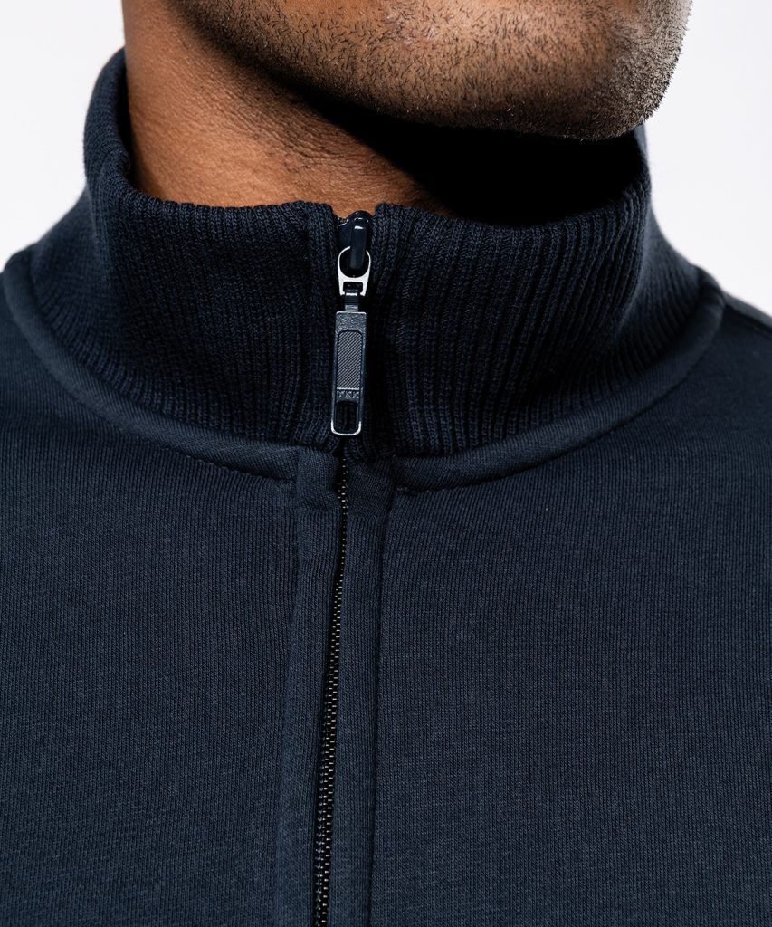 80% combed cotton/20% polyester. Low shrinkage brushed fleece. Silicone wash. Fitted style with ribbed side panels. Matching neck tape (except for White body where neck tape is Oxford Grey). Contrast striped ribbed inner collar (White for all colours, except for White body where stripes are Oxford Grey). 2 front pockets. Ribbed cuffs and hem. Zip fastening. Certified STANDARD 100 by OEKO-TEX Nー CQ 1007/8, IFTH.