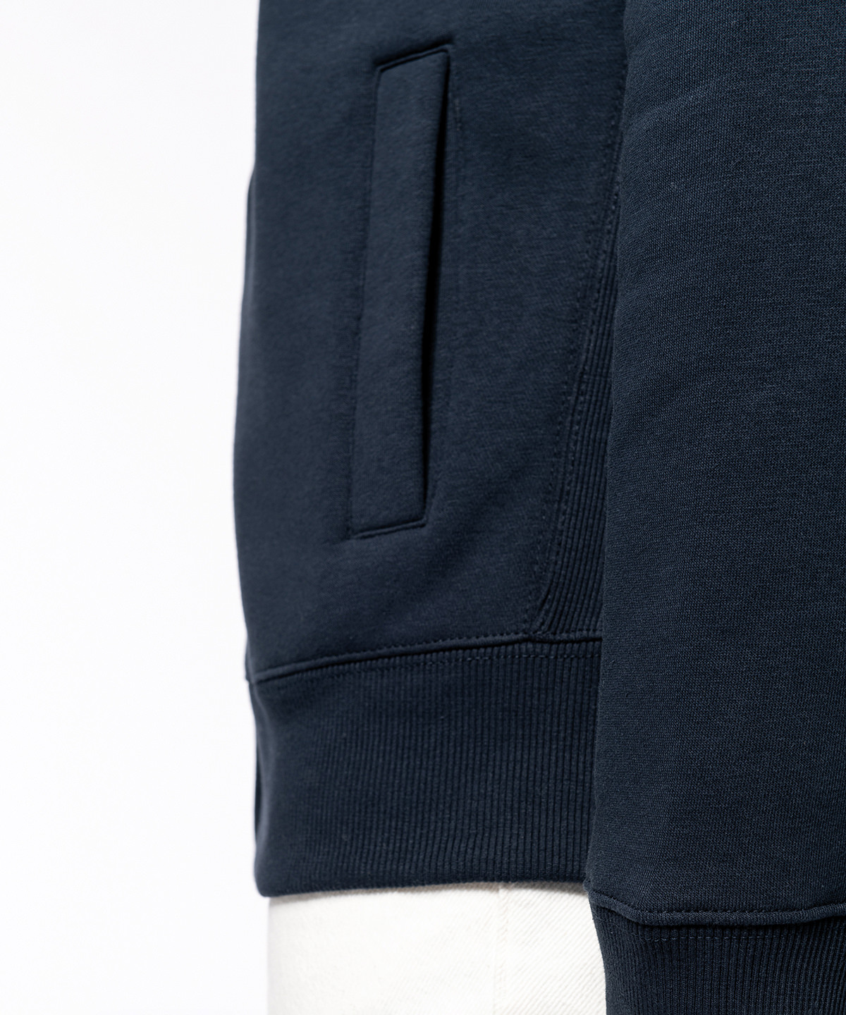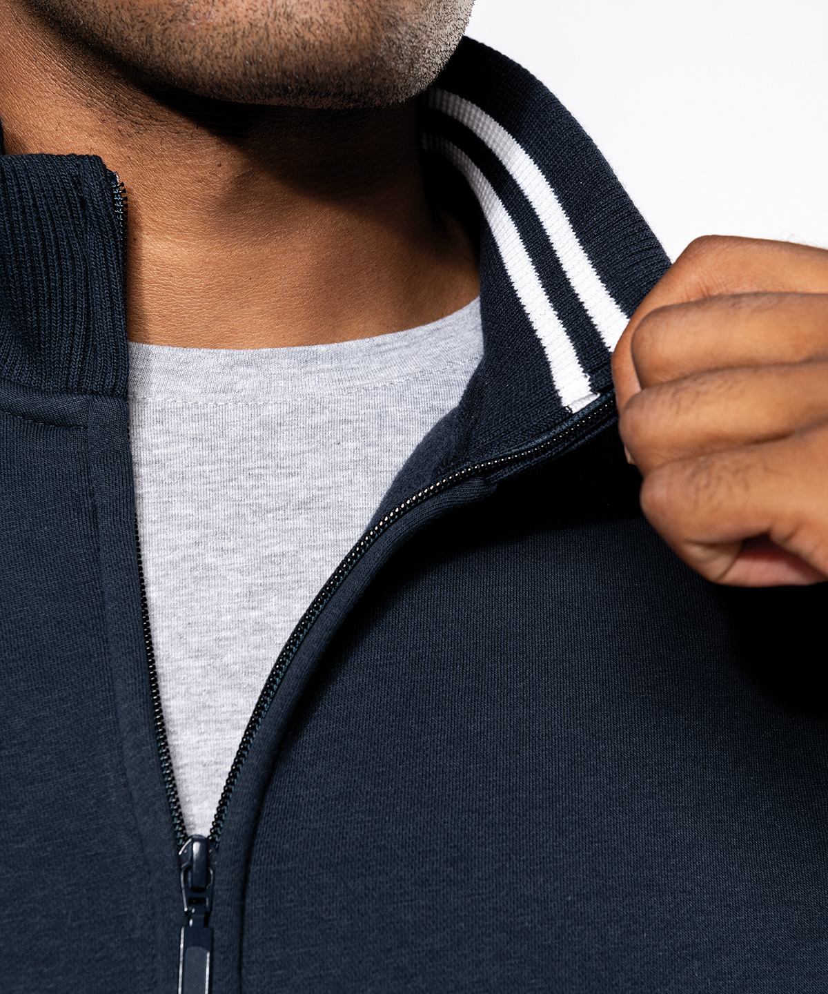 80% combed cotton/20% polyester. Low shrinkage brushed fleece. Silicone wash. Fitted style with ribbed side panels. Matching neck tape (except for White body where neck tape is Oxford Grey). Contrast striped ribbed inner collar (White for all colours, except for White body where stripes are Oxford Grey). 2 front pockets. Ribbed cuffs and hem. Zip fastening. Certified STANDARD 100 by OEKO-TEX Nー CQ 1007/8, IFTH.