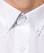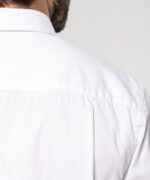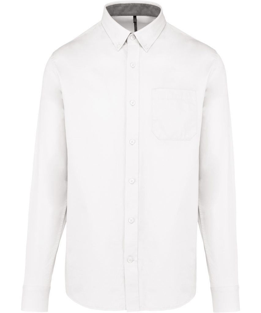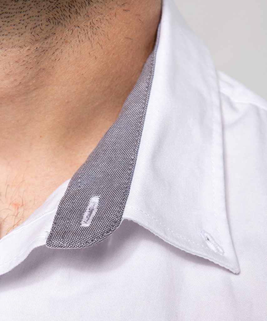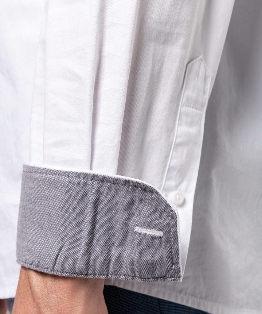 100% cotton. Twill fabric with peached soft touch. Button-down collar. Matching buttons. Chest pocket on left side. Contrast Oxford silver inner collar stand and cuffs. Back with 2 side pleats and lined yoke. Felled seam finish. Adjustable cuff with button pointed tab end. Spare button. Certifi・STANDARD 100 by OEKO-TEXNー CQ1007/8, IFTH.