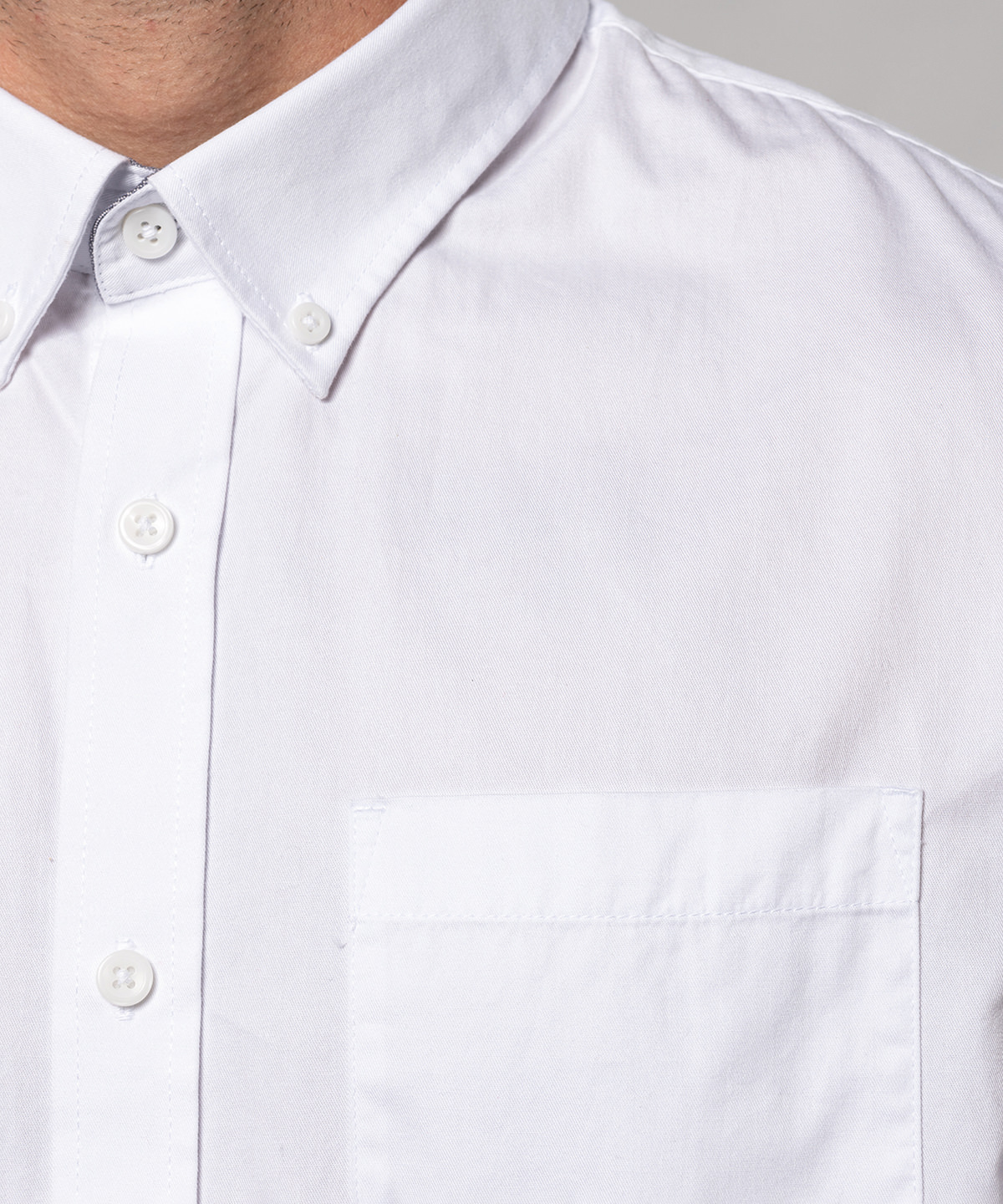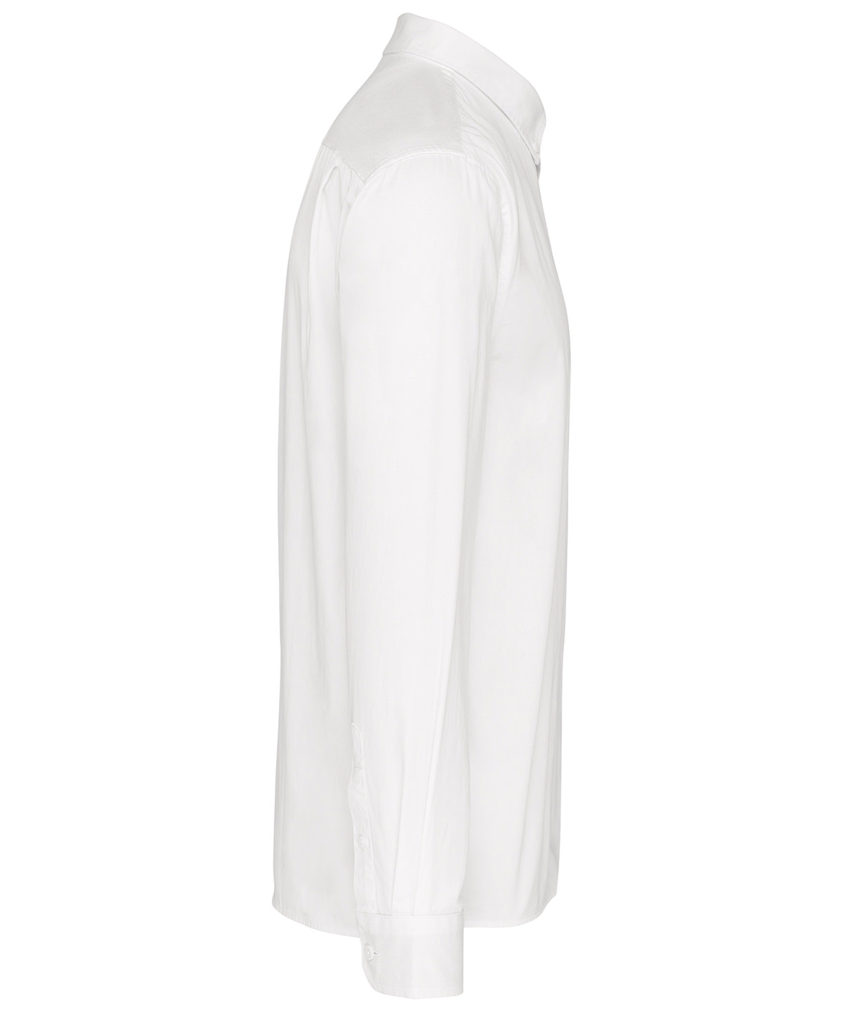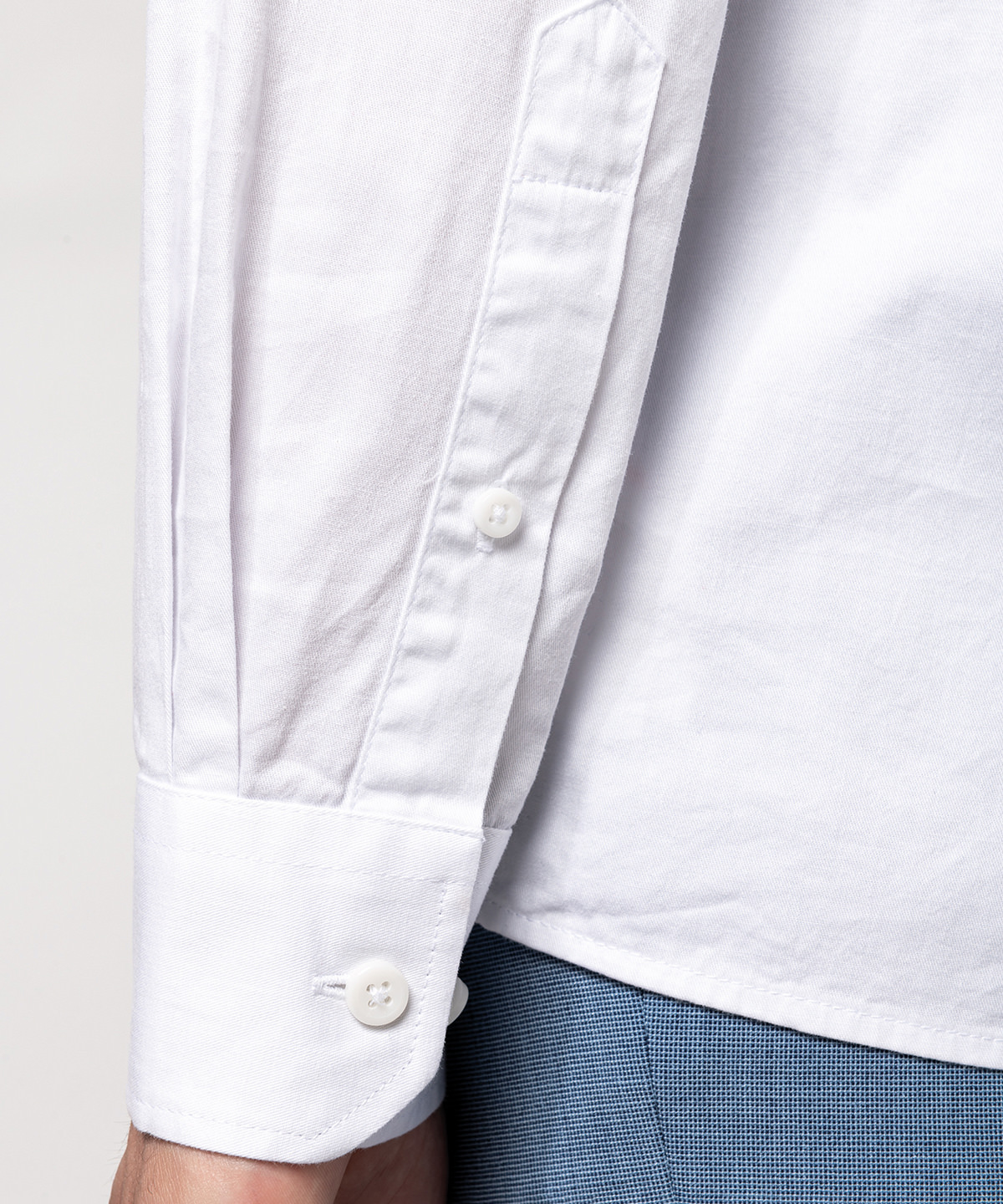 100% cotton. Twill fabric with peached soft touch. Button-down collar. Matching buttons. Chest pocket on left side. Contrast Oxford silver inner collar stand and cuffs. Back with 2 side pleats and lined yoke. Felled seam finish. Adjustable cuff with button pointed tab end. Spare button. Certifi・STANDARD 100 by OEKO-TEXNー CQ1007/8, IFTH.