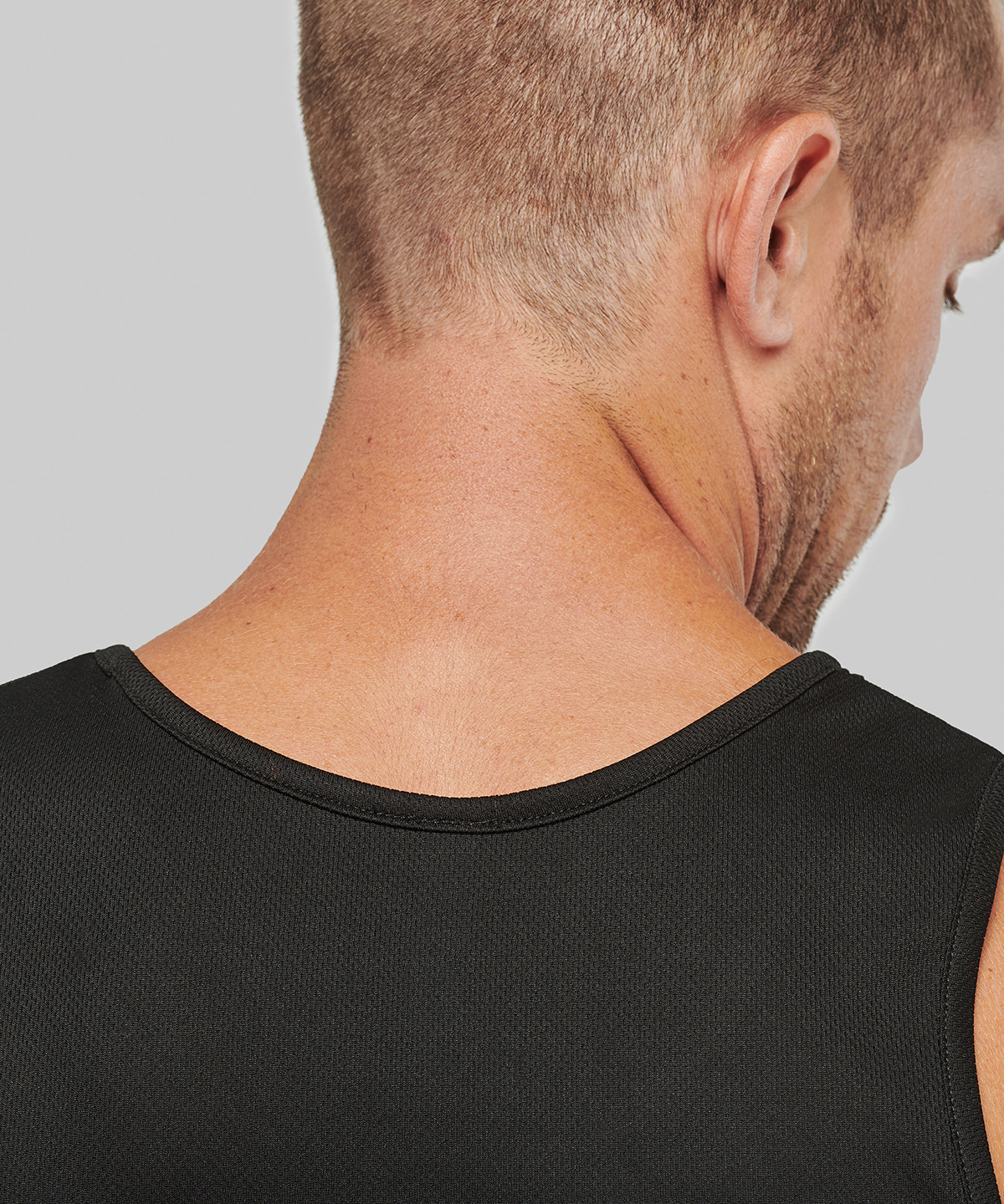 100% polyester. Quick-drying lightweight fabric. Bound neck and armholes. Twin needle finishing at the cuffs and hem. Certified STANDARD 100 by OEKO-TEX Nー CQ 1007/7, IFTH.