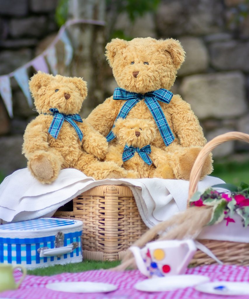 Join the teddy bear’s picnic with the Bracken bear, with light brown coloured fur and accessorised with a charming blue tartan ribbon.