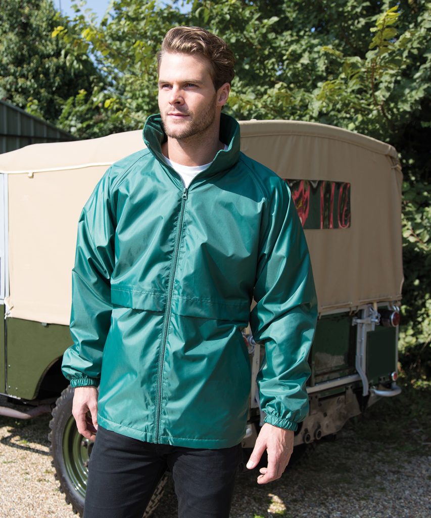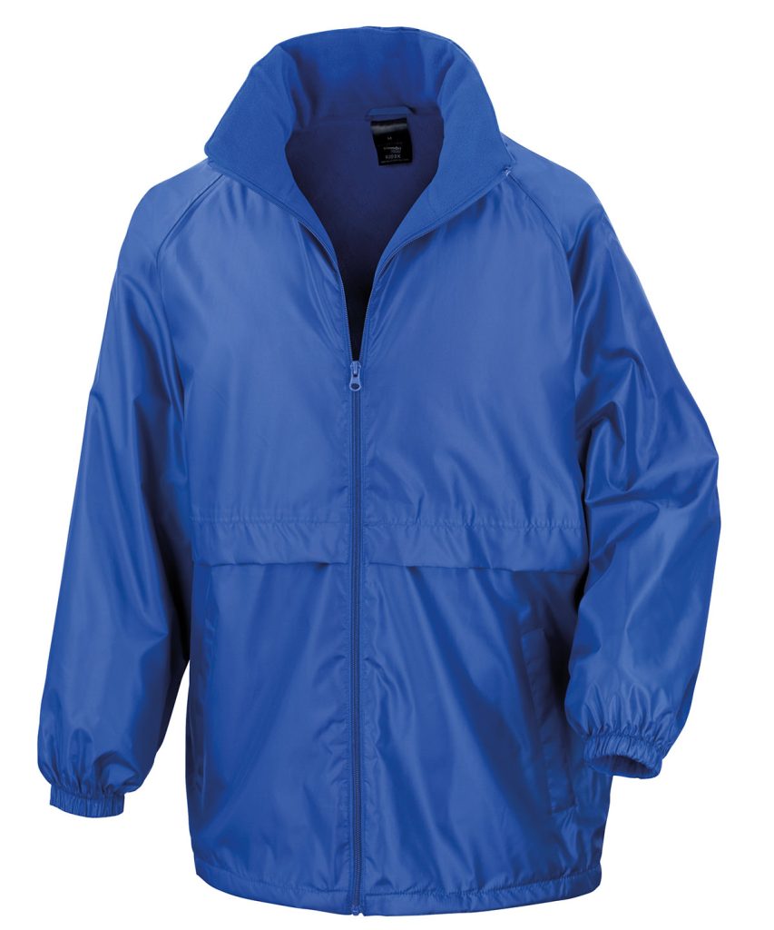 Waterproof (2000mm) ,lightweight ,windproof. Outer: StormDri PU coated polyester. Inner: 100% Polyester ,180gsm microfleece body and sleeve lining |