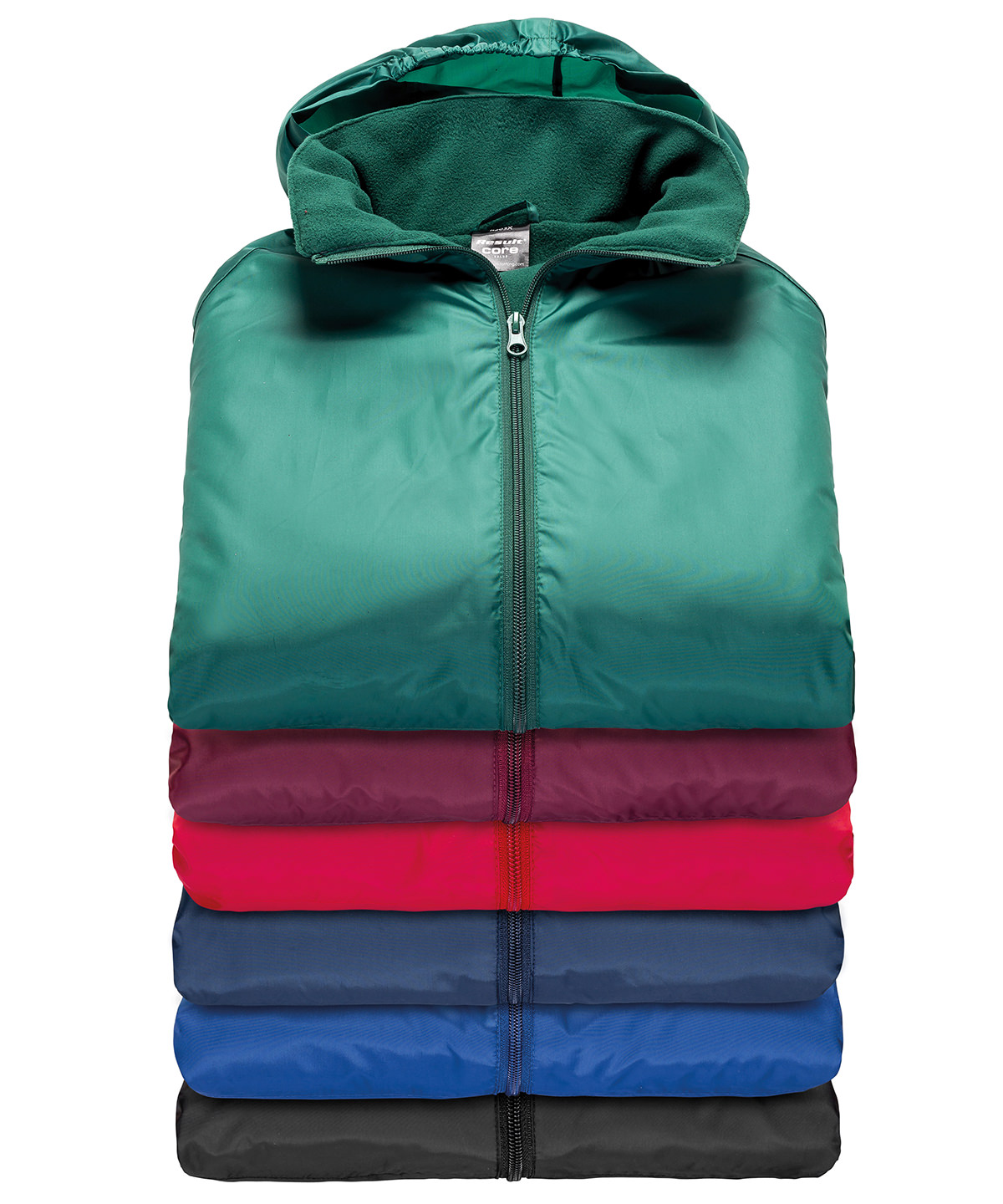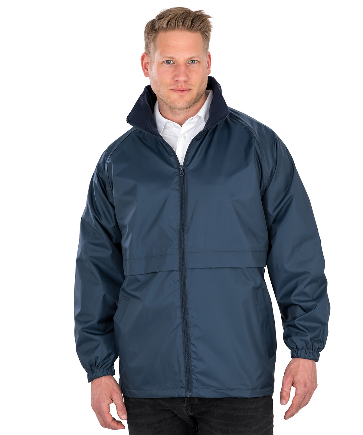 Waterproof (2000mm) ,lightweight ,windproof. Outer: StormDri PU coated polyester. Inner: 100% Polyester ,180gsm microfleece body and sleeve lining |