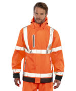 Scandinavian-styled hooded safety jacket in heavier-weight deluxe waterproof fabric with reflective printed safety bands.