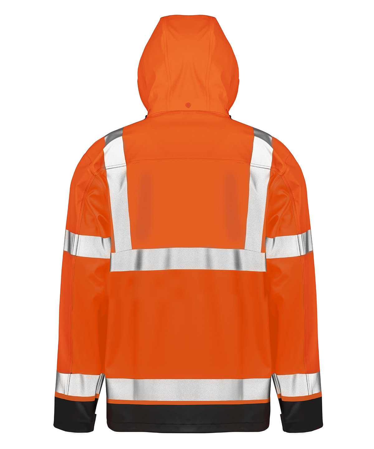 Scandinavian-styled hooded safety jacket in heavier-weight deluxe waterproof fabric with reflective printed safety bands.