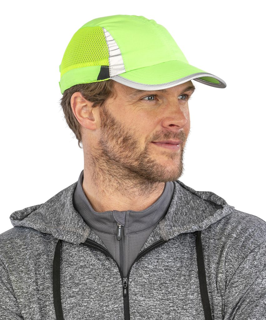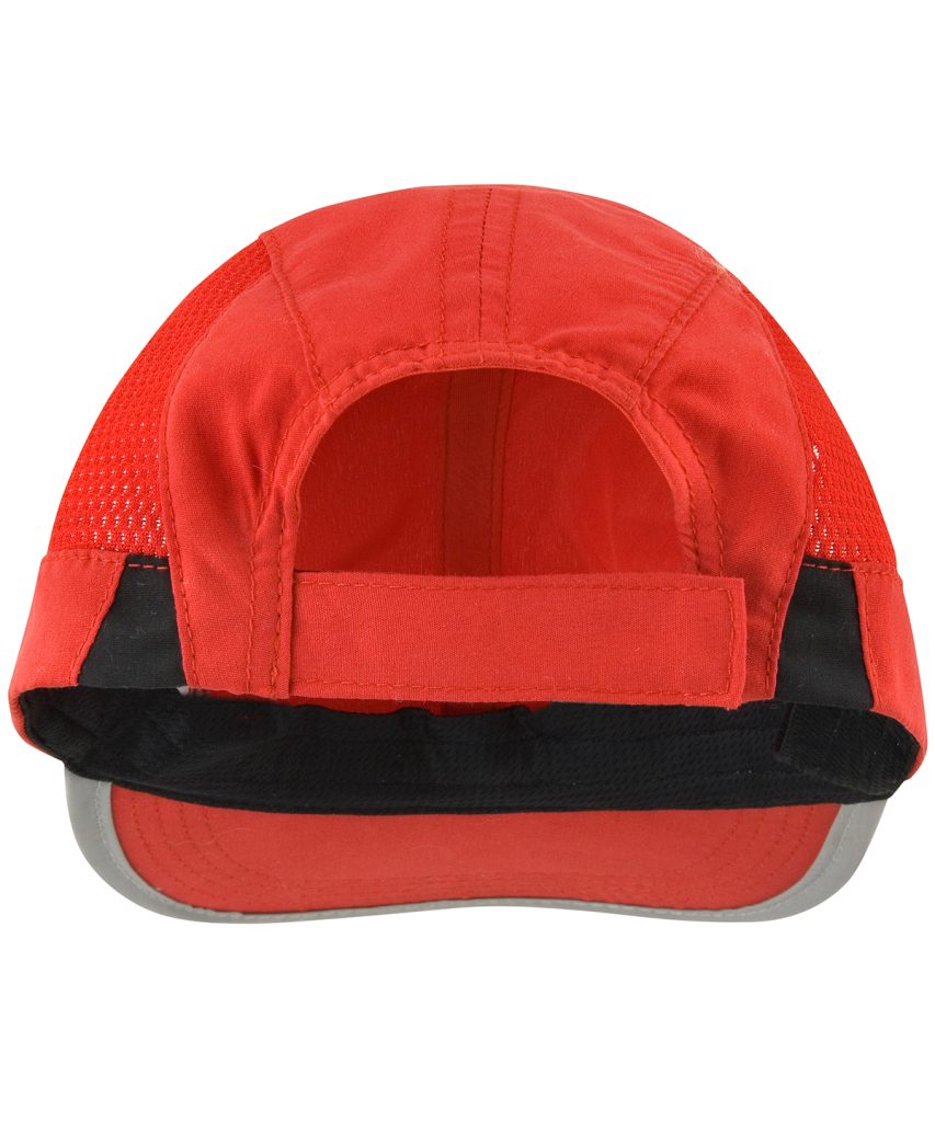 This is a feather weight sport cap in a low profile jockey style quick drying in a non crease sports fabric. Reflective detail to peak and crown. Tear release fabric size adjuster.