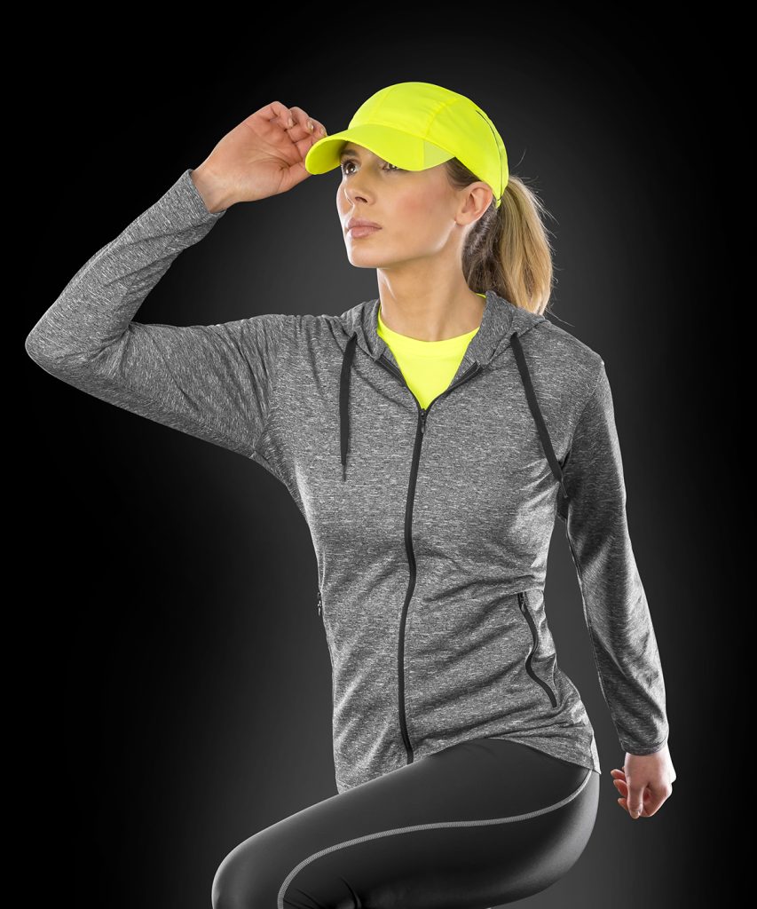 Super stretch lightweight t-shirt jacket hoodi in on-trend printed melange fabric with natural movement and sport cover.
