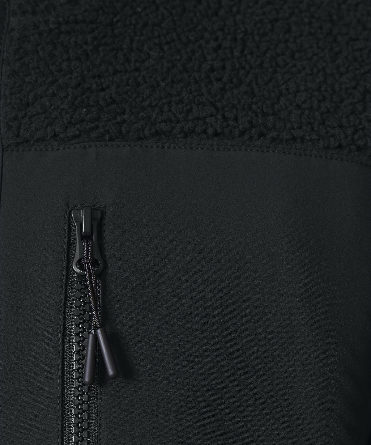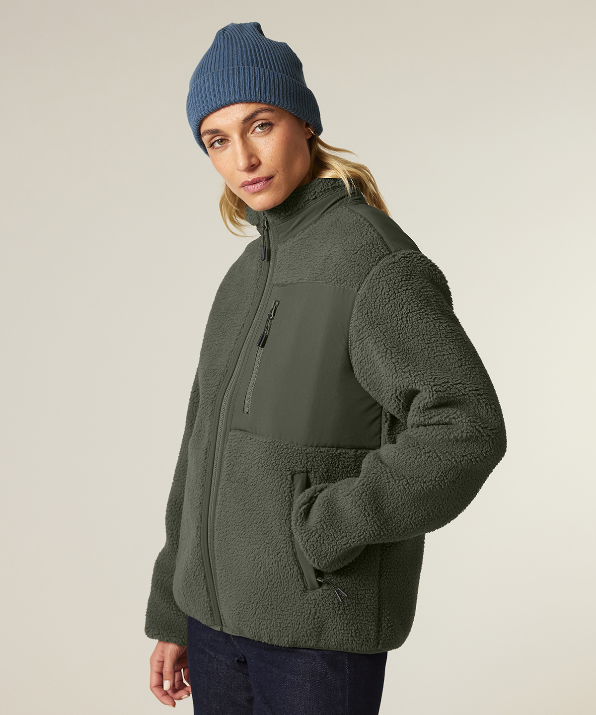 Premium unisex Sherpa jacket in 100% recycled polyester. Relaxed fit, 450gsm. Fully bonded inside fleece layer with an anti-pill finish. Contrast softshell inserts.