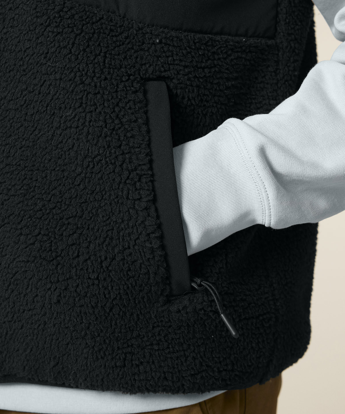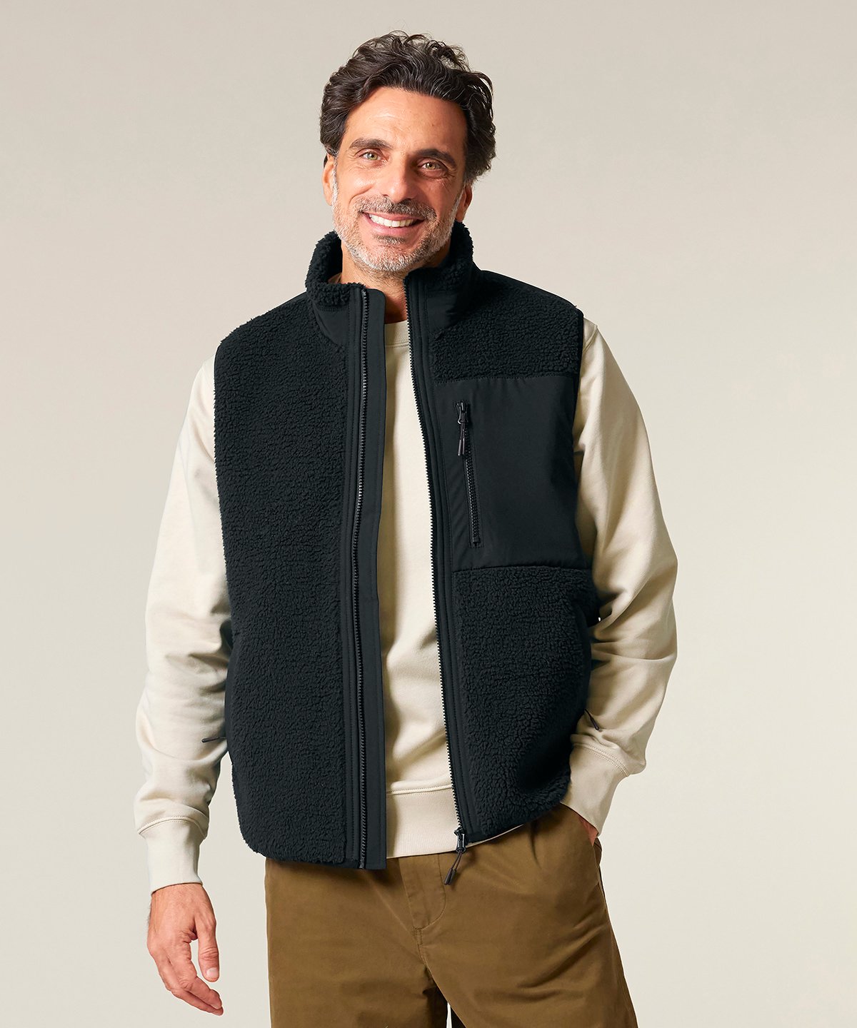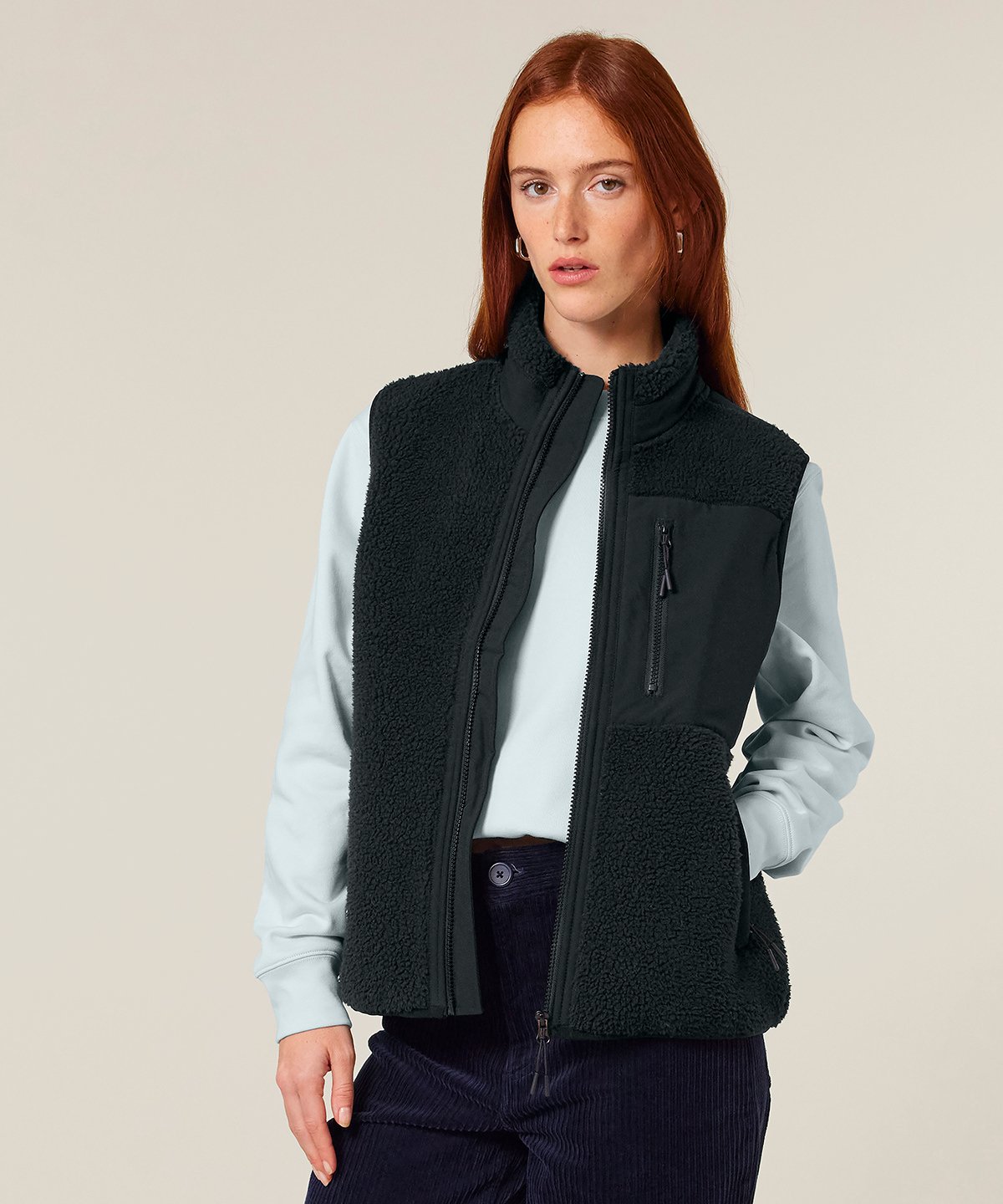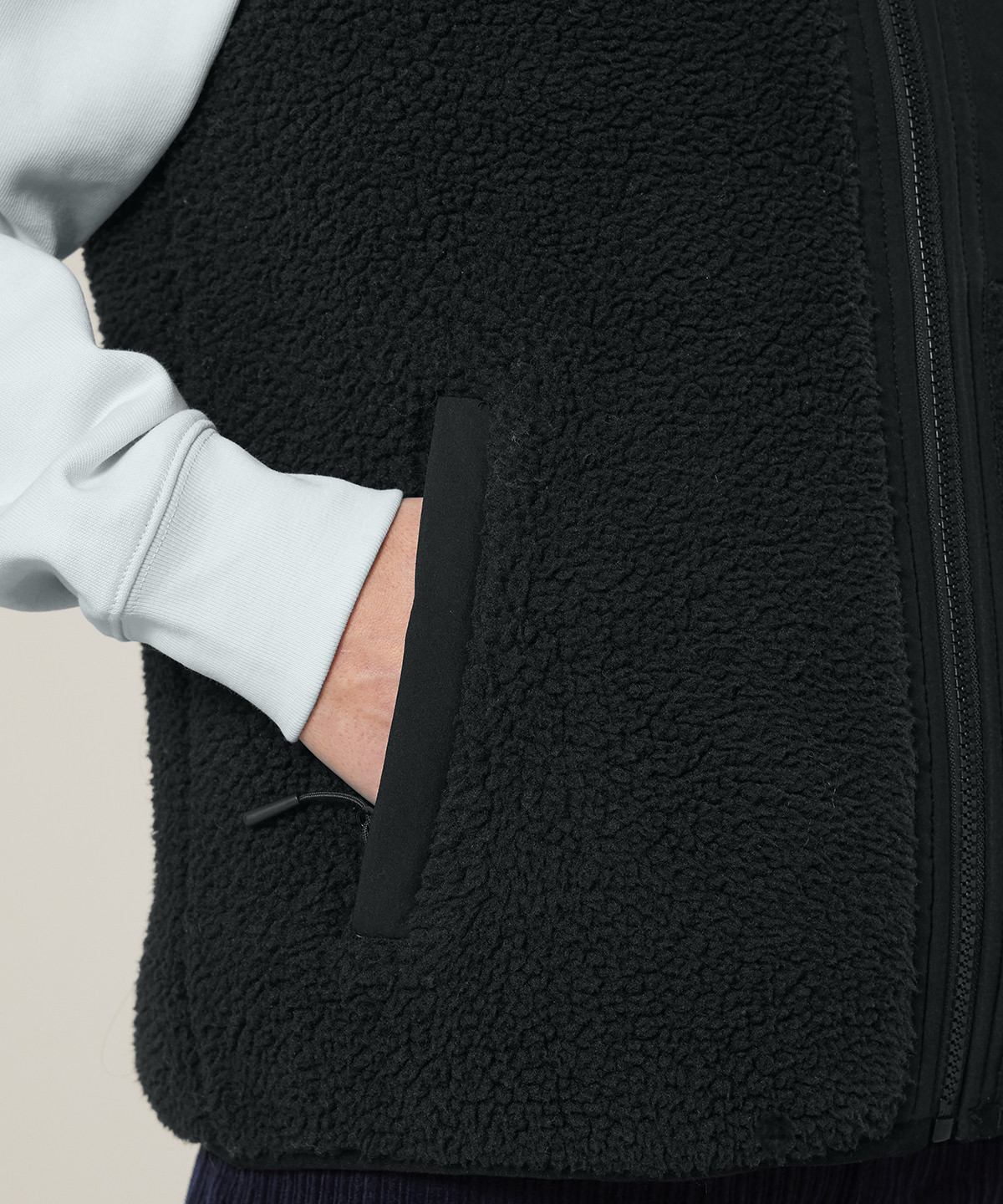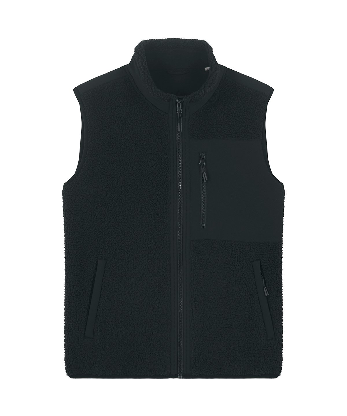 Premium, unisex, sleeveless sherpa jacket in 100% recycled polyester, 450gsm. Fully bonded inside fleece layer with an anti-pill finish. Contrast softshell inserts.