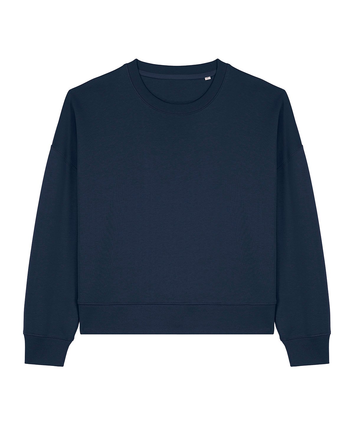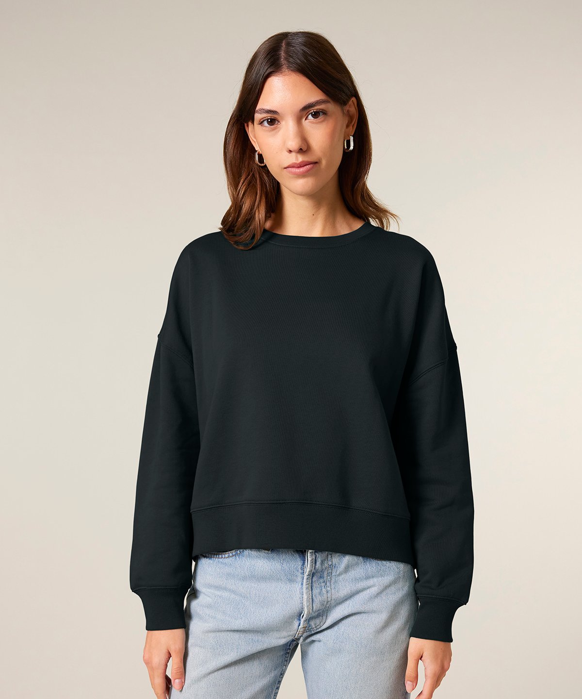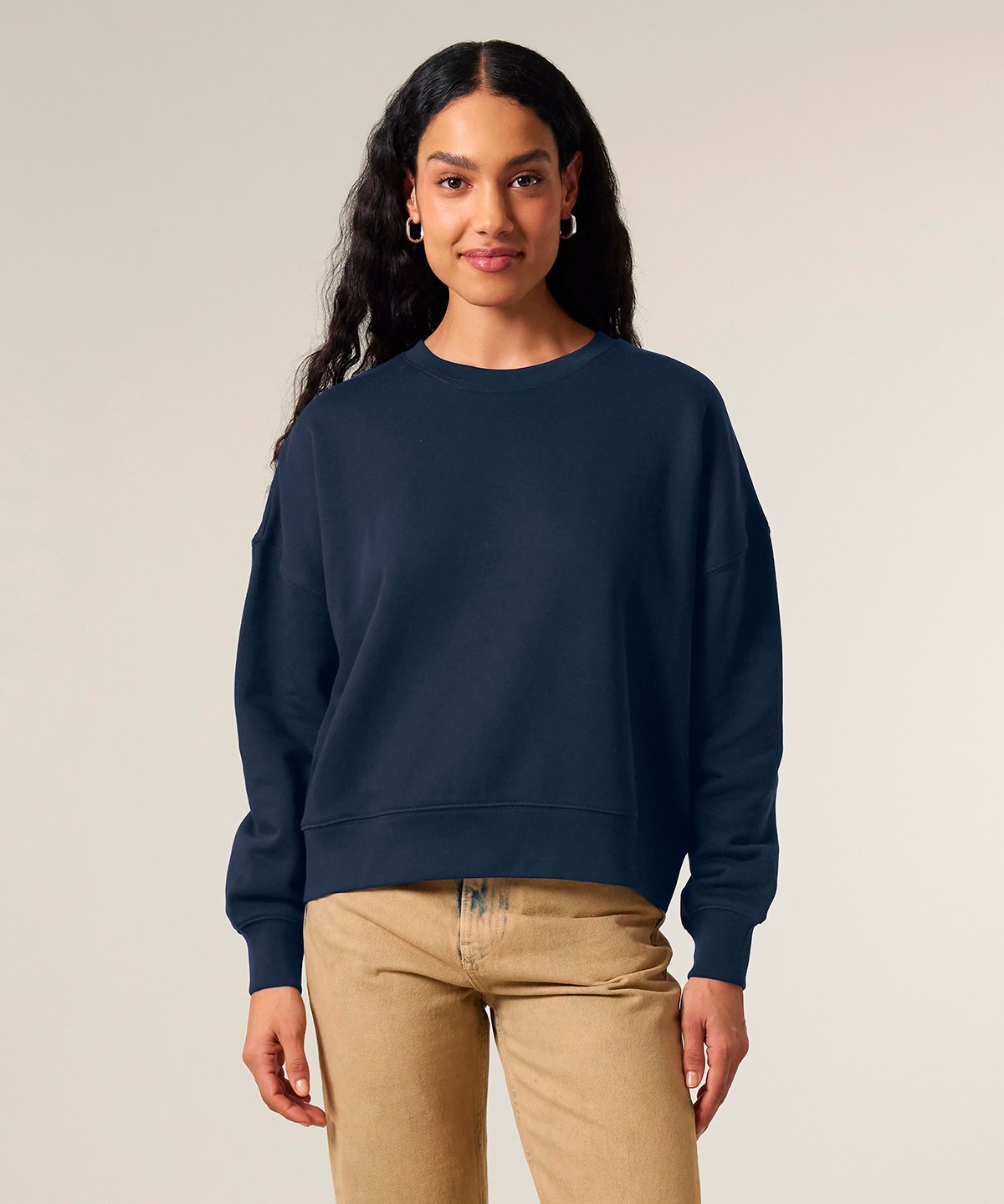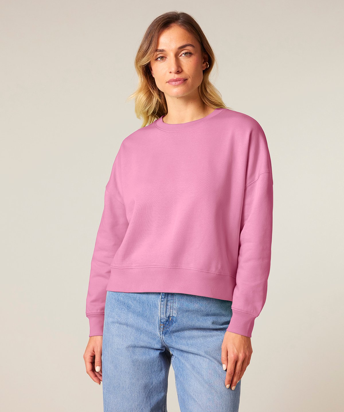 Premium womens crew neck sweatshirt in brushed 100% organic cotton, 300gsm. Dropped shoulders, adjusted length. Broad colour choice. Excellent printability.