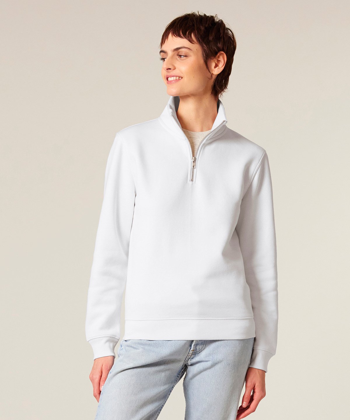 Premium, unisex, quarter-zip sweatshirt in 85% organic cotton and 15% recycled polyester. Medium fit, 280gsm. Ideal for corporatewear. Excellent printability.