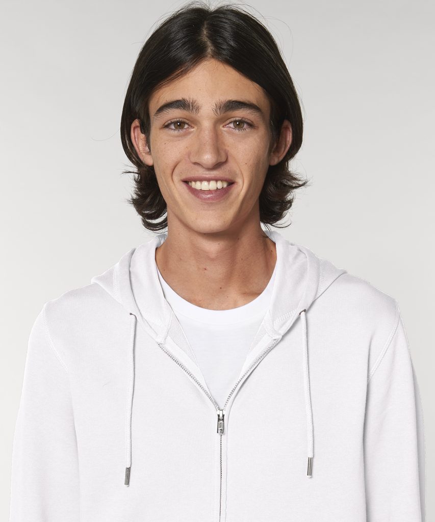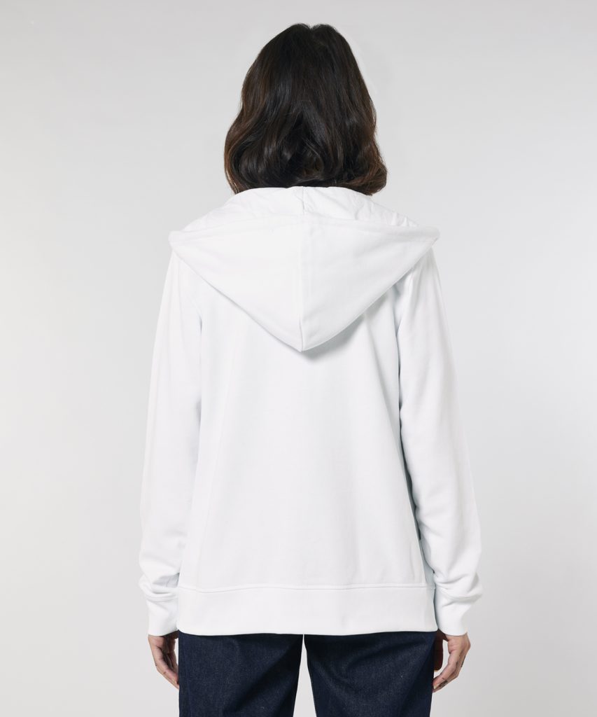 The essential easy-to-wear unisex zip-through hoodie sweatshirt in 300gsm terry crafted from premium 85% organic cotton and 15% recycled polyester and featuring single Jersey hood lining, flatlock stitching, and matt silver trims.