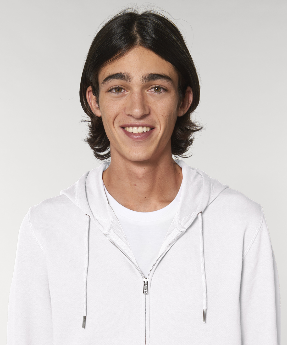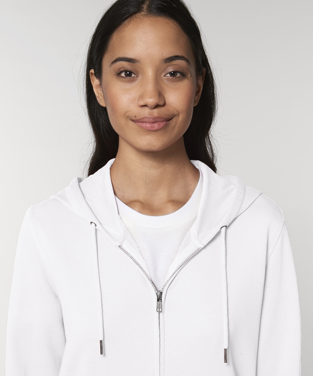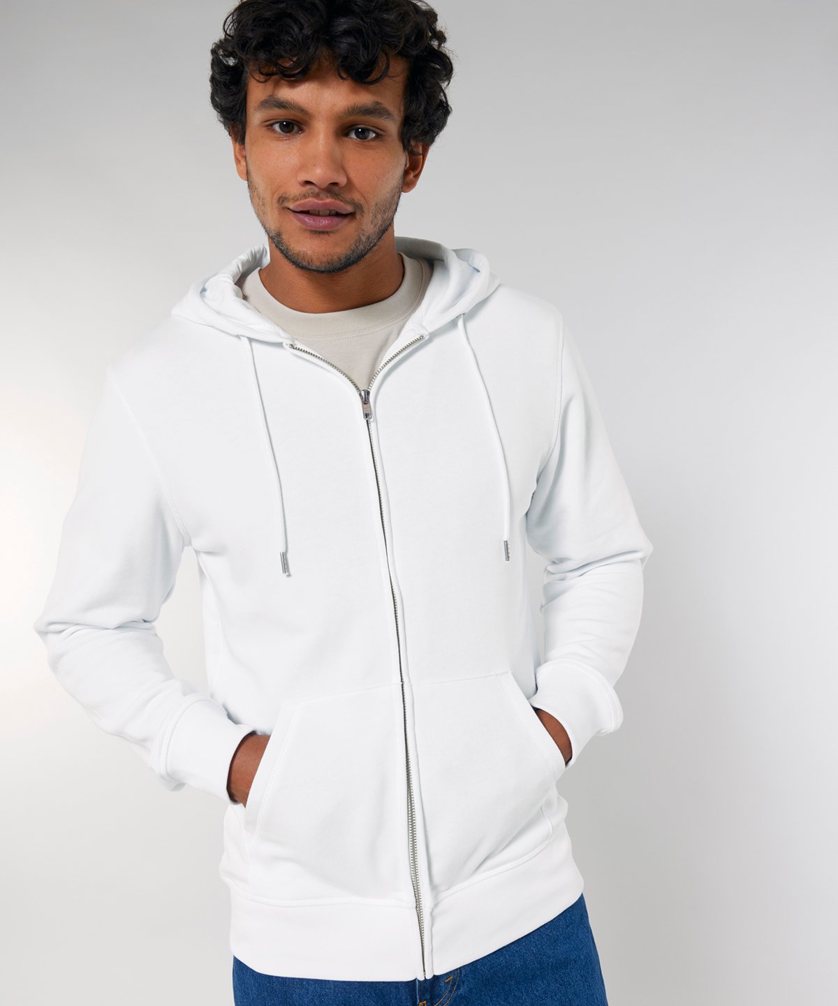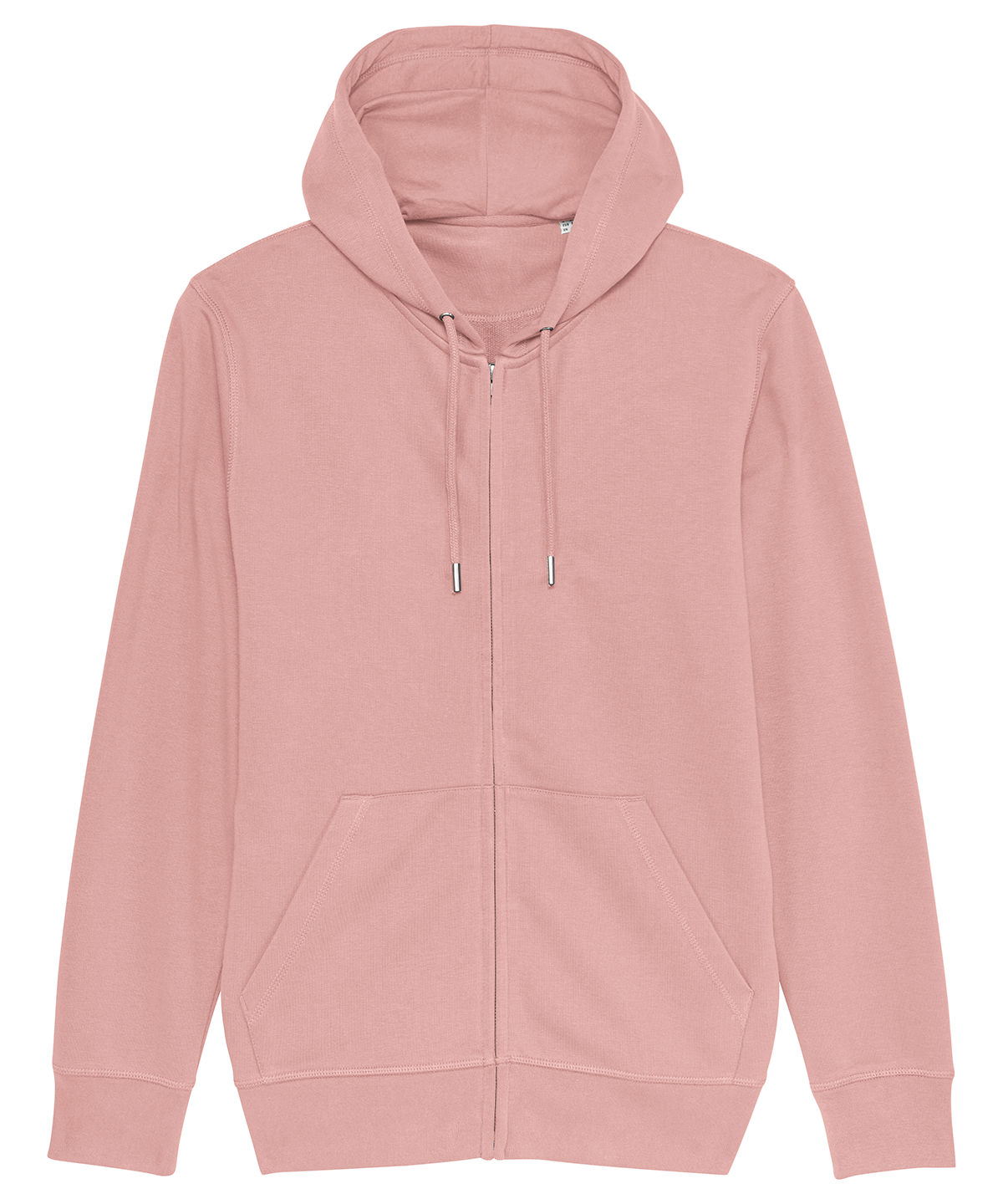 The essential easy-to-wear unisex zip-through hoodie sweatshirt in 300gsm terry crafted from premium 85% organic cotton and 15% recycled polyester and featuring single Jersey hood lining, flatlock stitching, and matt silver trims.