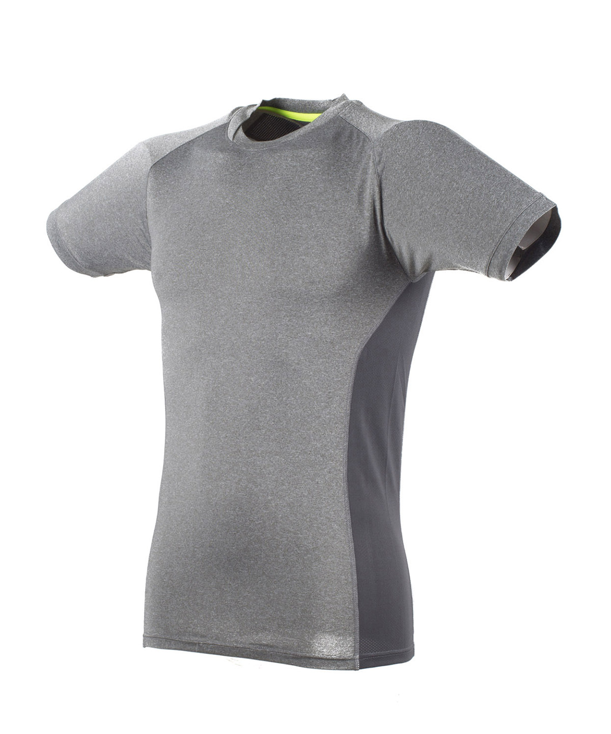 Elevate your style in this slim-fit performance tee. Polyester fabric with added stretch allows you to perform at your best, while the mesh side panels add breathability and shape.